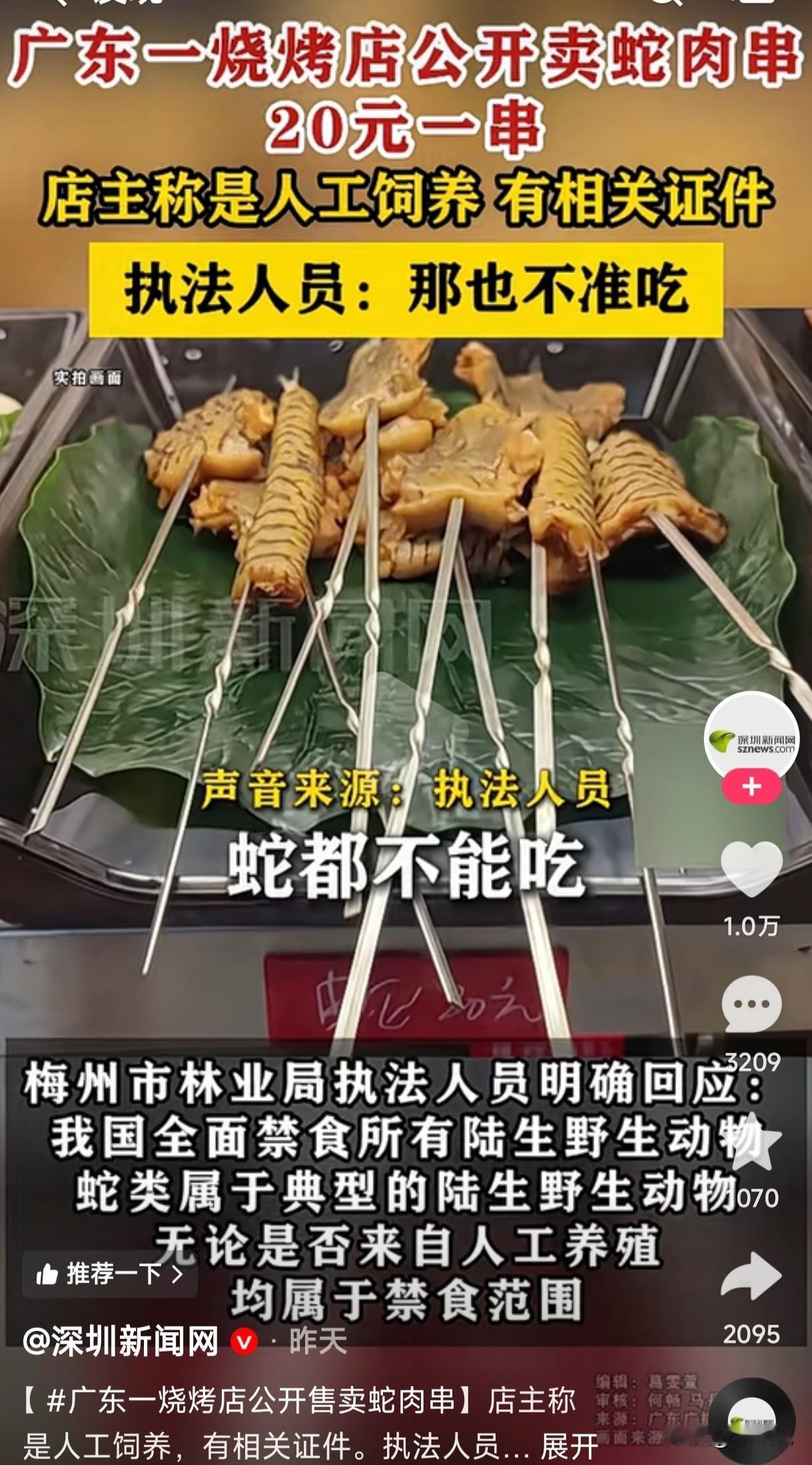你吃过蛇肉串吗? 广东一烧烤店公开卖蛇肉串,20元一串,执法人员回应不管是人工养殖还是野生的,我国全面禁食所有陆生野生动物蛇类。 话说这蛇看起来都让人害怕,心里瘆得慌,这居然烤熟还能吃嘛?就不怕吃了之后晚上睡觉做噩梦吗?有些人真是天上飞的,地上跑的,水里游的,什么东西都敢往肚子里吃,真是不得不佩服他们的勇气。 但蛇不管是野生的还是自己养殖的,都是禁食动物,就算你有证也不行,这是明文禁止的事实,蛇肉串不知道一串有多少,居然每串卖20元,这价格是不是只有有钱人才吃的起?我看见蛇都害怕,如果让我吃的话,蛇肉还没到嘴边估计已经晕过去了,想想都心里发怵,这玩意还敢吃吗?