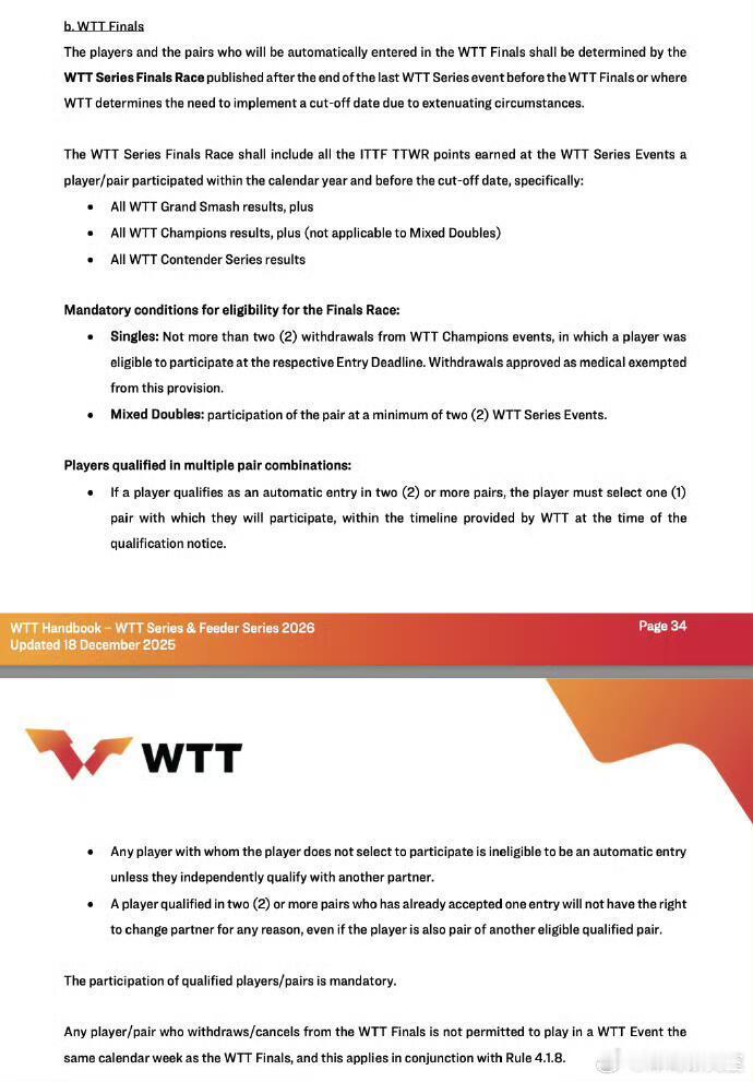WTT修改总决赛赛制2026WTT总决赛丨赛制变更🔶总赛程由5天变更为6天🔶混双取消小组循环赛,改为8强淘汰赛🔶WTT总决赛积分榜计算方式变更2026WTT总决赛球员/组合积分榜=在所有大满贯赛事中所获积分+在所有冠军赛赛事中所获积分(混双不适用)+在所有挑战赛赛事中所获积分🔶新增参加总决赛积分榜的强制性条件• 【单打】WTT冠军赛中,球员在相应的报名截止日期前符合参赛资格时最多只能退赛2次。因医疗原因获准退赛的球员不受此限制。• 【混双】该组合至少参加2站WTT系列赛