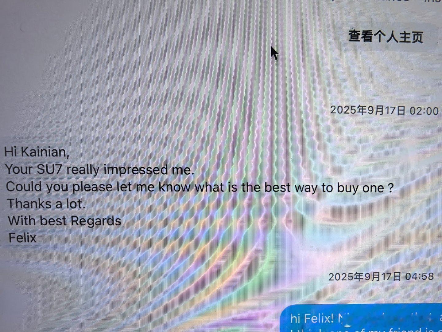 我们的小米SU7Ultra依然在德国发挥余热!!这次是大众中国前CEO试驾完的感受之前一直没和大家汇报,我们这台SU7Ultra这段时间一直在一位德国朋友手里保管。就是那个在Carwow节目里和我们崩直线然后输给我们的爆改兰博基尼Gallardo车主Felix。他自己本身玩儿爆改兰博和保时捷,还有一个workshop专门做一些豪车的保养和改装。九月份carwow崩直线节目的拍摄当天,他在输给我们之后没好意思问,但第二天他在Instagram上私信我(图三),“Your SU7 really impressed me,What is the best way to buy one?”(你的SU7太屌了,我怎么买?)我当时心里想的是,你就是那个天选之子!我这台就可以含泪加价卖你我们今年来纽北去古德伍德去carwow直线加速赛这么一大圈就是为了认识你由于一些手续问题,我们这台车无法直接卖给他,但我决定还是把Ultra留给他体验一段时间。因为在深聊过几次之后,我们一致觉得这台车会给德国高性能豪华车市场投下一枚重磅炸弹。果不其然,车发给他之后,因为他身边很多朋友都是资深的豪华车车主以及汽车行业从业者,我们得到了非常多有意思的一手反馈。多人开过ultra之后都私下表示想要一台,但因为德国人比较忌讳公开吹中国车(即使内心是认可的),而且他的这些客户朋友基本都是企业家所以比较注重隐私,所以这个信息一直没有扩散开,直到,昨天这位大众中国前CEO发了他的试驾感受。。。Felix说“I had a few more very high level guys in your car for a Test Drive...but he was actually the first to break the silence. ”(其实还有其他更有名更有地位的汽车行业从业者也开了你的车,但他是第一个打破沉默的)所以我觉得现在也是时候把我们这台ultra在德国的后续故事告诉大家了。。。除此之外,前段时间Felix还主动提出想来中国体验更多国产电动车(当然也是在我的循循善诱之下),我们也带他在北京度过了一周让他极其难忘的时光。更有特殊意义的是,央视财经频道在了解了这个情况之后还专门跟拍了Felix来北京找我的这段时间,而且还把我们今年从纽北到古德伍德到Carwow到最后Felix来国内体验更多国产电车的故事拍成了纪录片,相信不久就可以和大家见面了。所以说,虽然2025年快要过去了,但我怎么觉着我们和这台小米SU7Ultra的故事,还要有更多无法预料的精彩呢 北京·和平东桥