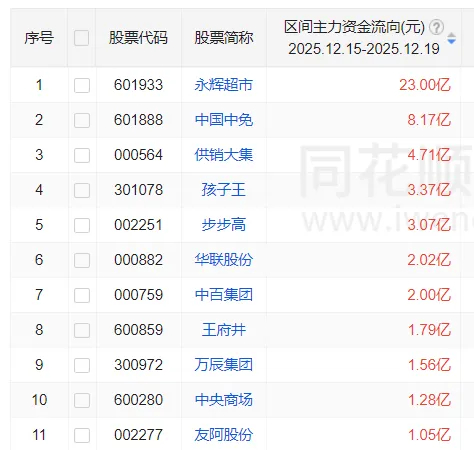 商业零售一周主力资金买入前10股1 永辉超市 23.00亿 2 中国中免 8.17亿 3 供销大集 4.71亿 4 孩子王 3.37亿 5 步步高 3.07亿 6 华联股份 2.02亿 7 中百集团 2.00亿 8 王府井 1.79亿 9 万辰集团 1.56亿 10 中央商场 1.28亿股票a股