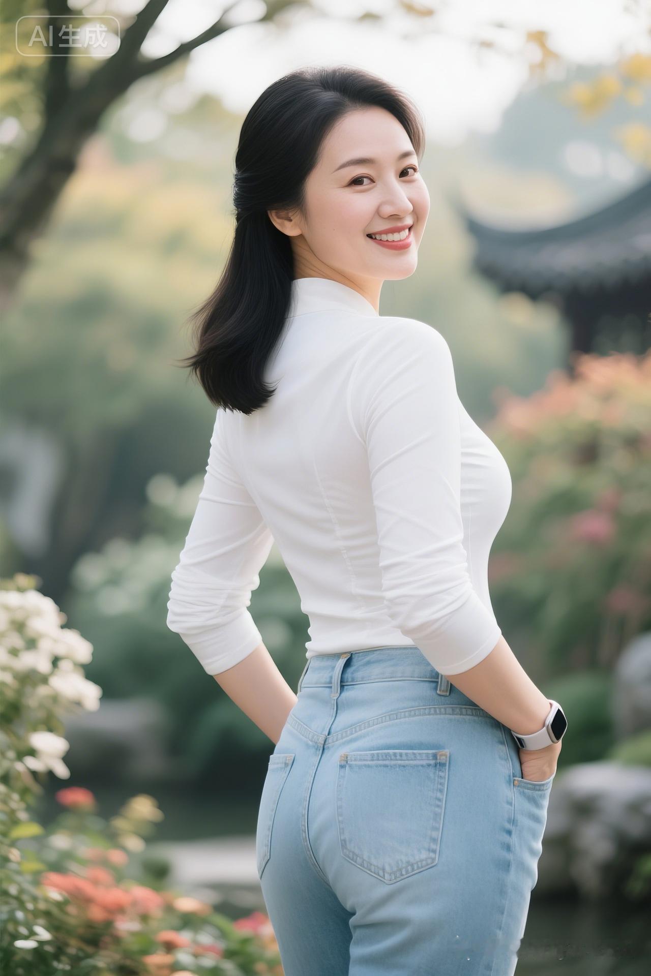 秋日暖阳下,微笑的少女与古风建筑相映成趣。