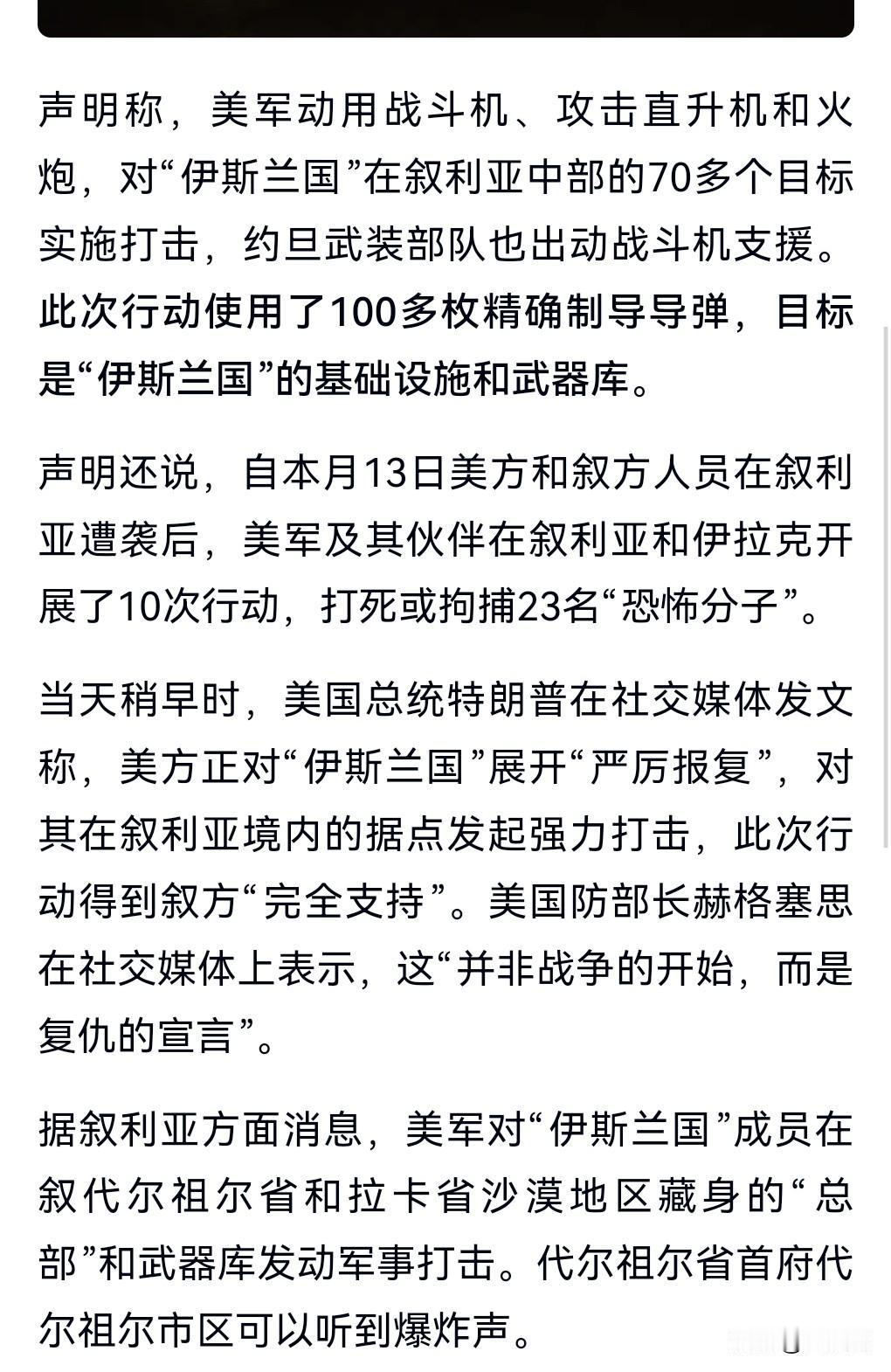 伊斯兰国好像是一个恐怖组织吧。 如果这是恐怖组织的话,那必须打击啊。 当地东部时间19日16:00。 美军用超100枚导弹空袭“伊斯兰国”,目标就是伊斯兰国的武器库和设施。 这个就厉害了啊,擒贼先擒王,让伊斯兰国失去战斗力,这一招确实是相当的妙啊。