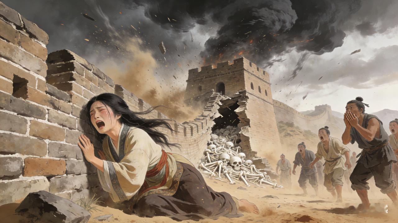 那一声哭嚎 震塌了万里长城 北风卷着雪粒子,抽打在孟姜女的脸上,生疼。 她裹紧了身上单薄的棉衣,怀里揣着刚缝好的寒衣,一步一踉跄地走在冰封的路上。 三个月前,她的丈夫范喜良,还是那个会在月下为她弹唱的温柔书生。可一道征兵的圣旨,撕碎了他们新婚三日的美满。范喜良被强行押往边关,去修那万里长城,临别时,他攥着她的手,红着眼说:“等我回来。” 这三个字,成了孟姜女日日夜夜的念想。 眼看寒冬将至,她怕丈夫受冻,连夜赶制了棉衣,揣上干粮,毅然踏上了寻夫之路。没人知道她走了多少路,磨破了多少双鞋,饿了就啃口干粮,渴了就捧把雪水,风餐露宿,只为寻到那个心心念念的人。 一路打听,一路跋涉,她终于到了长城脚下。 可眼前的景象,让她浑身冰凉。 尘土飞扬的工地上,民夫们衣衫褴褛,被监工的鞭子抽打得叫苦不迭,长城的砖石下,不知埋了多少累累白骨。 她抓住一个路过的民夫,声音发颤:“大哥,请问范喜良……他在这里吗?” 民夫打量着她,叹了口气,指了指不远处的一段城墙:“姑娘,你来得太晚了。范喜良早就累死了,监工嫌麻烦,直接把他埋在长城底下了。” 一句话,如晴天霹雳,击碎了孟姜女所有的希望。 她踉跄着扑到那段冰冷的城墙下,手抚着粗糙的砖石,放声大哭。 “喜良啊!我来看你了!你怎么就这么走了啊!” “你说过要回来的,你怎么忍心丢下我一个人啊!” 哭声凄厉,穿透了呼啸的北风,听得周围的民夫都红了眼眶。 她哭了三天三夜,眼泪流干了,嗓子哭哑了。 忽然,天地变色,狂风怒吼,只听“轰隆”一声巨响!那段埋葬着范喜良的长城,竟轰然倒塌了数丈,露出了底下森森的白骨。 孟姜女一眼就认出了丈夫的尸骨——他的手上,还戴着那枚她亲手编织的草戒。 她抱着尸骨,泪如雨下,再也没哭过一声。 后来,人们说,是孟姜女的痴情哭塌了长城,是她的爱意,撼动了天地。 可没人知道,那塌的不是长城,是一个女子破碎的心。 民间故事 孟姜哭城