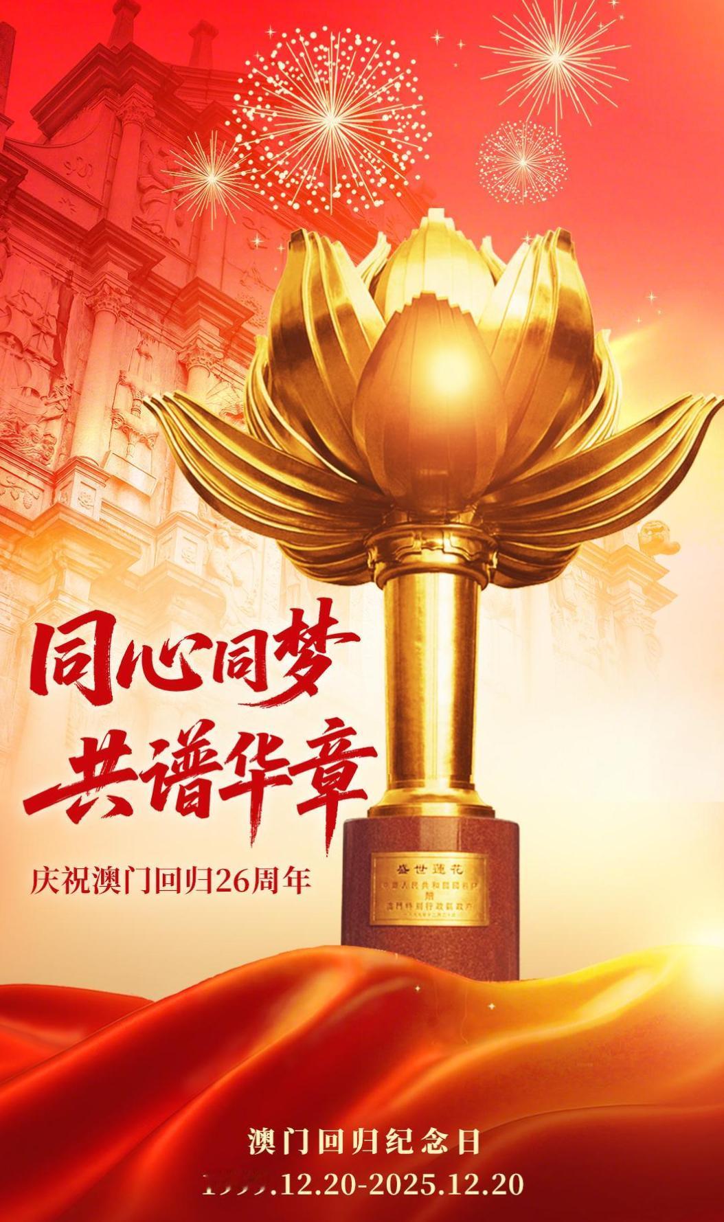 庆祝澳门回归26周年! 今天是2025年12月20日,星期六,乙巳蛇年农历十一月一日,是澳门回归祖国26周年纪念日。 1999年12月20日零时,中葡两国政府澳门政权交接仪式在澳门文化中心花园馆举行。自此,饱经沧桑的澳门终于回到祖国怀抱。 二十六载风雨兼程,澳门与祖国同心同行,在“一国两制”方针的引领下,经济实现蓬勃发展,居民生活水平打大幅提升,呈现欣欣向荣的昌盛景象。 如今,站在崭新的起点,焕发出全新的活力,澳门以更加昂扬的姿态,迈向广阔美好的明天,祝福澳门,明天会更好!