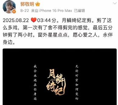 郭敬明团队全员没睡,对《月鳞绮纪》进行定剪。 早九点,发博表示:舍不得剪完,看来要提上日程了。