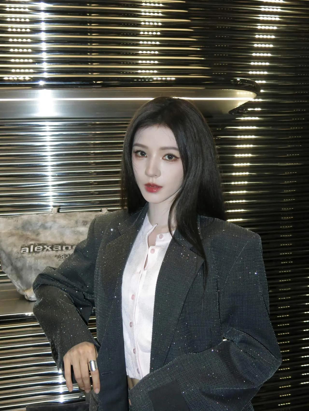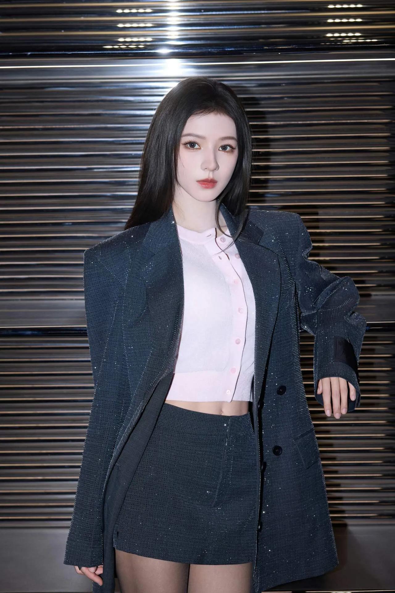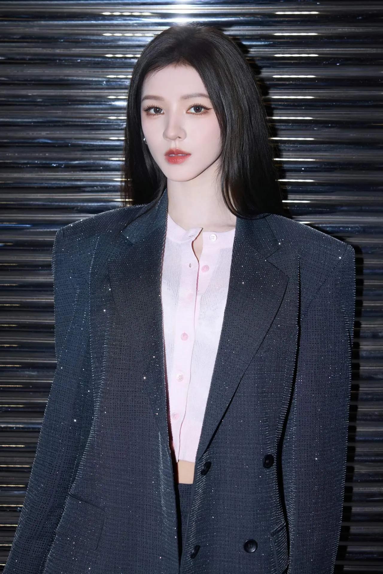 张予曦的西装搭配太有一套了! 在Alexander Wang活动上,她穿闪钻黑西装套装配粉色内搭,超酷又带甜。Oversize西装满是细闪,低调奢华,粉色短款针织开衫露腰,凸显腰线。同系列短裙搭黑丝,甜酷交织,少女感与摩登气场并存。另一套全黑造型,修身针织裙勾勒曼妙身姿,袖口裙摆的字母织带暗藏巧思,厚底黑靴更添气场,黑长直发型适配度拉满。 在北京环球,她穿灰色西装外套搭蓝色阔腿牛仔裤,扎高马尾戴眼镜,休闲又亮眼。半脱外套露小腹,身材有料,玩得超开心。