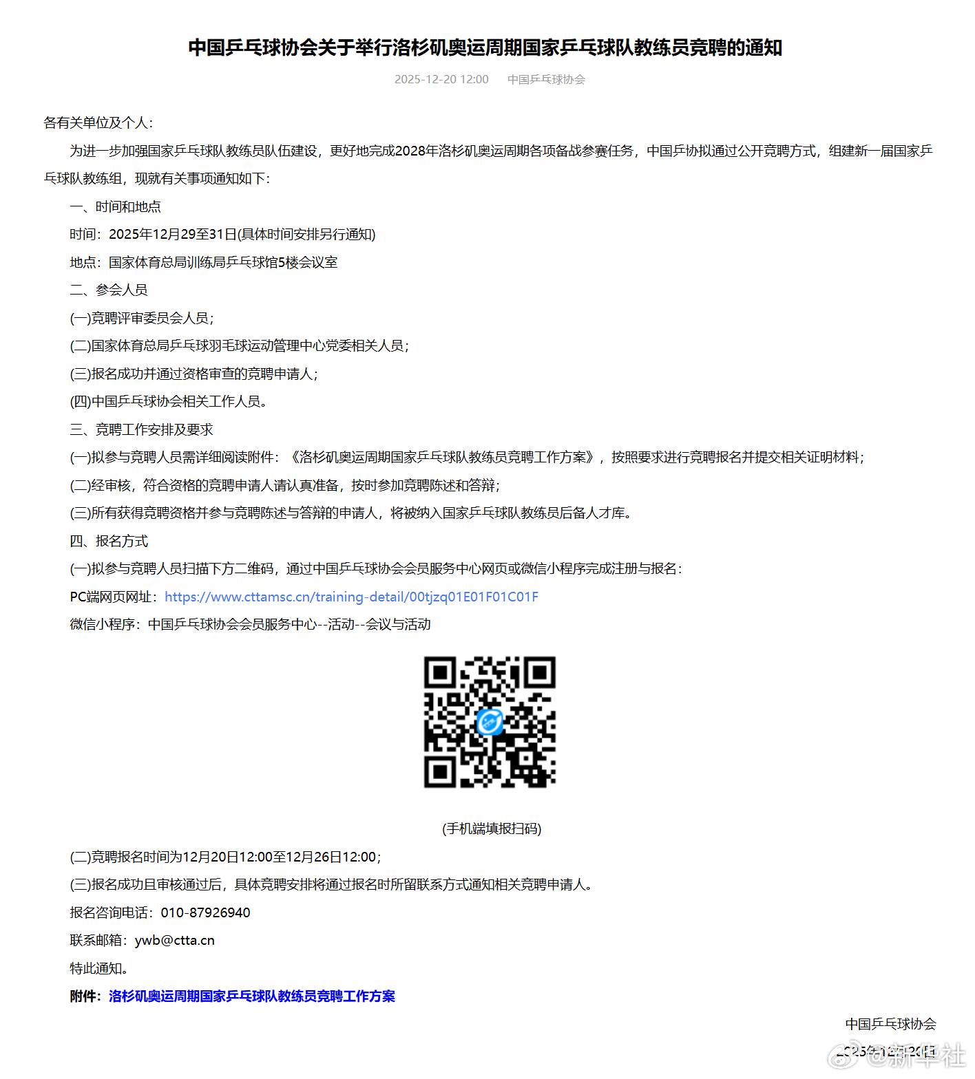 #洛杉矶奥运周期国乒增设副总教练#【#中国乒协启动洛杉矶奥运周期国家队教练员竞聘工作#】中国乒乓球协会官网20日发布《中国乒乓球协会关于举行洛杉矶奥运周期国家乒乓球队教练员竞聘的通知》,正式启动新周期国家队教练员公开竞聘工作。 本次竞聘工作将于12月29日至31日在国家体育总局训练局乒乓球馆举行。在岗位设置上,本次竞聘紧密围绕洛杉矶奥运会的实战需求与队伍长远建设进行科学规划。除总教练岗位外,增设副总教练岗位,并对各教练岗位的职责与能力标准提出了更为清晰和更高的要求,突出强调先进的训练理念、卓越的临场指挥能力、技术创新意识以及培养青年后备力量的综合素养。#国乒将选出总教练# 据悉,中国乒协成立专项工作小组研究制定了《洛杉矶奥运周期国家乒乓球队教练员竞聘工作方案》,严格按照程序报经上级组织审批后执行。 竞聘工作将通过公开报名、资格审核、竞聘陈述和答辩、评审委员会无记名投票以及最终结果公示等环节,产生总教练1人、副总教练1人、国家队主教练男、女队各1人、国家青年队主教练男、女队各1人、国家队教练员12人、国家青年队教练员10人。 评审委员会由中国乒协有关负责人、乒乓球项目专家、乒乓球项目科研人员代表、优秀运动员代表组成。国家体育总局乒乓球羽毛球运动管理中心党委派人对本次竞聘工作进行监督,确保竞聘工作的严肃性、合规性与权威性。 中国乒协表示,期待通过此次公开竞聘,进一步优化国家队教练员队伍结构,选拔出能够引领国家队再创奥运辉煌的优秀教练队伍,同时也为全国乒乓球教练人才提供一个展示与交流的高规格平台,共同巩固中国乒乓球的人才根基。