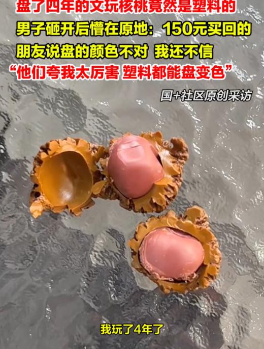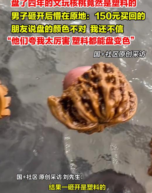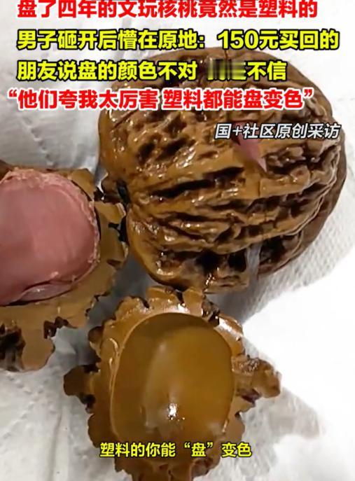 伤害性不高侮辱性极强!近日,河北唐山,男子盘了四年文玩核桃,结果给朋友展示时,对方一眼就指出他这个有问题,一开始男子还不信,结果砸开一看,才发现是塑料的,盘了四年就算了,当初他还花了150块钱购买的。 咱们身边总少不了几个热衷文玩的伙计,有人偏爱揉手串,有人钟情搓核桃,图的就是手里别闲着,给平淡日子添点乐子。 河北唐山的刘先生便是这么一位,他对那对文玩核桃的痴迷劲,那可是出了名的,整整四年啊,不管刮风下雨,这核桃就像长在他身上似的,兜里揣着,手里盘着,那层油亮的包浆,任谁看了都得竖大拇指,夸一句“这功夫下得深”。 可谁能料到,这四年的满腔热忱,最后竟演变成了一出令人捧腹的荒诞剧。 刘先生这人,四十多岁的年纪,平日里也没啥不良嗜好,就爱钻研些文玩小件,四年前他在本地古玩集市溜达,一眼就被这对核桃勾了魂,那摆摊的也是个能说会道的主,拍着胸脯打包票,说这是正儿八经的麻核桃,纹路那叫一个清晰,配对那叫一个规整,要是盘好了,温润如玉,当个传家宝都行。 刘先生听得那叫一个心花怒放,跟摊主在那儿磨了半天嘴皮子,最后掏了150块,美滋滋地把这“宝贝”请回了家,这钱虽不多,但在他心里,这就跟捡了漏似的。 自打那以后,这对核桃就成了刘先生的“心头肉”,早上公园遛弯,屁股刚挨着长椅,核桃就上手了,中午歇个晌,手里也不闲着,晚上追剧,指尖那点摩挲声都成了伴奏,要是赶上朋友聚餐,那更是高光时刻,非得掏出来显摆显摆。 这四年功夫真没白费,核桃颜色眼看着变深,红里透亮,摸上去跟丝绸似的滑溜,刘先生自己也是越看越爱,逢人便夸:“瞧瞧我这核桃,这质感,没谁了!”周围朋友大多是门外汉,也就跟着起哄,夸他眼光独到,会养东西。 前些日子,刘先生的一位发小来串门,这位可是个行家里手,平时就好这口。 酒过三巡,菜过五味,刘先生老毛病又犯了,掏出核桃就开始盘,还特意凑到发小跟前嘚瑟:“哥们儿,给掌掌眼,这可是我盘了四年的心血,怎么样?”发小接过核桃,左看右看,又掂了掂分量,最后还拿起来敲了敲,眉头一皱,来了句:“老刘,我说句你不爱听的,你这核桃不对劲啊。” 这一句话把刘先生说毛了:“啥叫不对劲?这可是我当祖宗伺候了四年的宝贝,能有啥问题?”发小也不含糊,直言不讳:“上手太轻了,没那份量感。再听这声儿,发飘发脆,不像真核桃那种浑厚的木头声。还有这颜色,看着贼亮贼亮的,不像自然包浆,倒像是塑料盘出来的。” 刘先生一听这话,酒劲也上来了,拍着桌子就急了:“你可别瞎咧咧!当年那摊主说得好好的,正经麻核桃,怎么可能变塑料?你是不是喝多了看走眼了?” 两人一来二去杠上了,发小那股较真劲儿也上来了:“你不信是吧?那是骡子是马咱拉出来溜溜。找个东西砸开看看!要是真的,我赔你一对更好的,要是假的,你也别再拿个假货当宝贝供着了。” 刘先生也是个倔脾气,心想“砸就砸,谁怕谁啊”,再加上最近本来也想换对新核桃玩玩,借着酒劲,转身就找了把锤子,照着核桃就砸了下去。 只听“咔嚓”一声脆响,核桃应声而裂,两人凑过去一看,刘先生瞬间像被雷劈了一样,傻眼了。 哪有什么核桃仁啊,材质明显是塑料,断面上甚至还能看到注塑的痕迹,刘先生捏着那几块碎塑料片,愣是半天没憋出一句话,脸上一会儿红一会儿白,那尴尬劲儿就别提了,刚才那股争辩的气势瞬间泄了个精光,只剩下满脸的哭笑不得。 过了好一会儿,刘先生自己先忍不住乐了:“好家伙,我这天天当宝贝似的盘了四年,合着是盘了个塑料疙瘩!这一百五十块钱倒没啥,可惜我这四年的功夫啊,全搭在这个假货身上了,这传出去得让人笑掉大牙。” 后来刘先生一查才知道,现在的造假技术那是真高,这种塑料核桃全是模具压出来的,纹路逼真,表面还特意做了做旧处理,不懂行的根本看不出来。 这事儿发到网上后,网友们也都乐疯了,有人调侃说:“这塑料核桃能让你盘出包浆来,说明您这手也是一绝,毅力可嘉!”还有人打趣道:“这说明塑料质量不错,四年都没盘坏。” 细琢磨这事,其实挺有警示意义,现在大家伙儿玩文玩都图个乐呵,但这里面的坑确实不少。 尤其是像核桃这种门槛看似不高的东西,假货泛滥成灾。真核桃那是大自然的产物,纹路独一无二,手感沉稳,声音厚重,而这种工业流水线出来的塑料仿品,纹路死板,手感轻飘。 大伙儿以后买这类物件,真得多留个心眼,不懂行的最好别盲目下手,不然像刘先生这样付出了几年感情,最后发现是个笑话,那心里才叫一个堵得慌。 不过换个角度想,虽说核桃是假的,但这四年盘玩过程中的快乐是真的,就当是花钱买了个长期的“解压玩具”,也不算亏到底。 对此你怎么看? 信源:新界视频