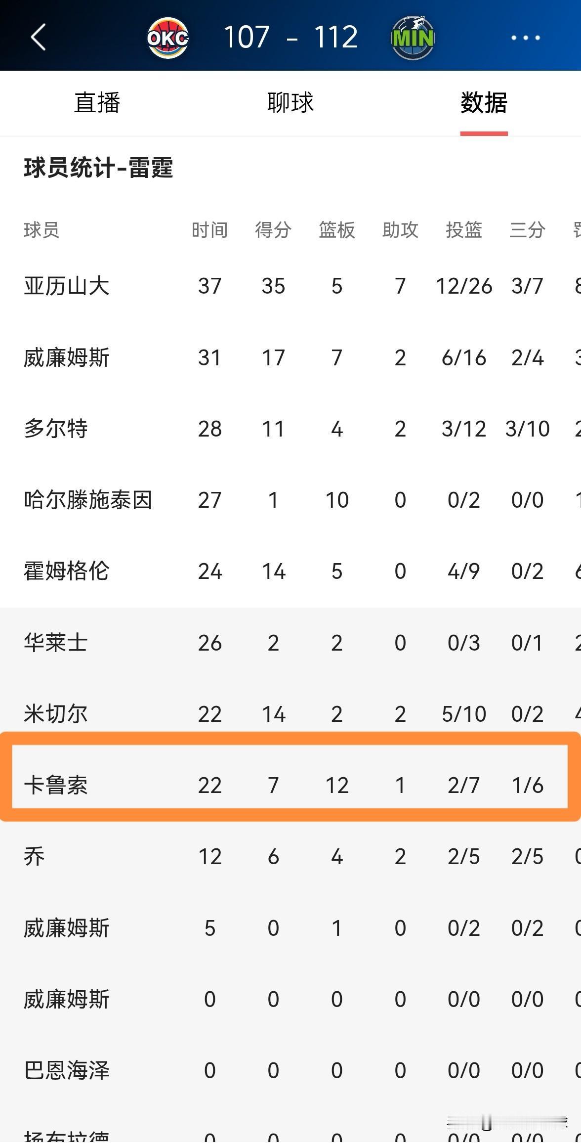 我强烈建议雷霆将卡鲁索交易走!在今天雷霆客场以107:112不敌森林狼的比赛中,卡鲁索在投篮端非常的低迷。全场比赛下来,卡鲁索替补出战22分钟,投篮7中2,其中三分球6中1、罚球2中2仅仅得到7分,他的场上正负值为-7。 我相信即便雷霆将卡鲁索摆上货架,卡鲁索依然是无人问津,卡鲁索距离退役已经不远了。