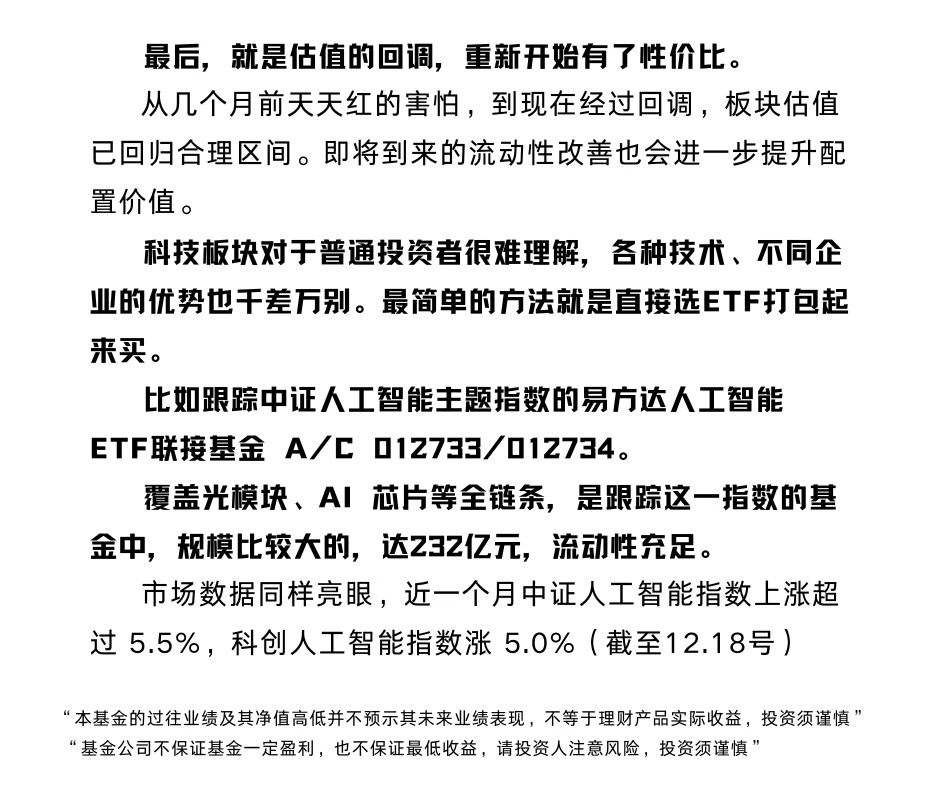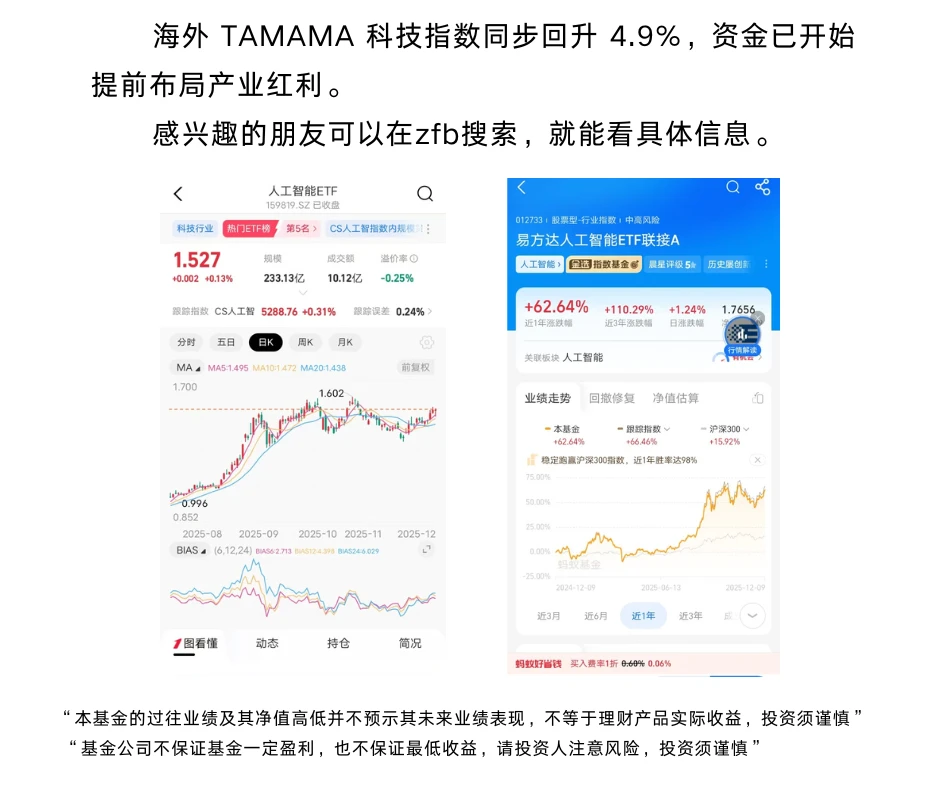 市场数据同样亮眼,上周中证人工智能指数上涨 6.4%,科创人工智能指数涨 5.1%,海外 TAMAMA 科技指数同步回升 4.9%,资金已开始提前布局产业红利。(截至12.18号)