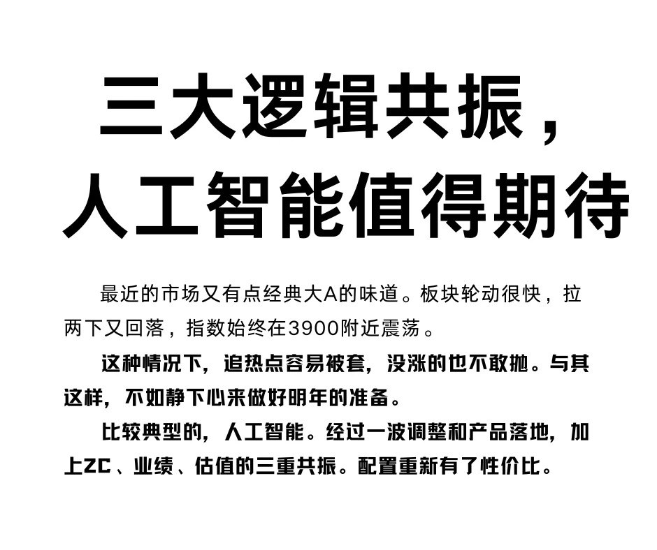 比较典型的,人工智能。经过一波调整和产品落地,加上zc、业绩、估值的三重共振。配置重新有了性价比。