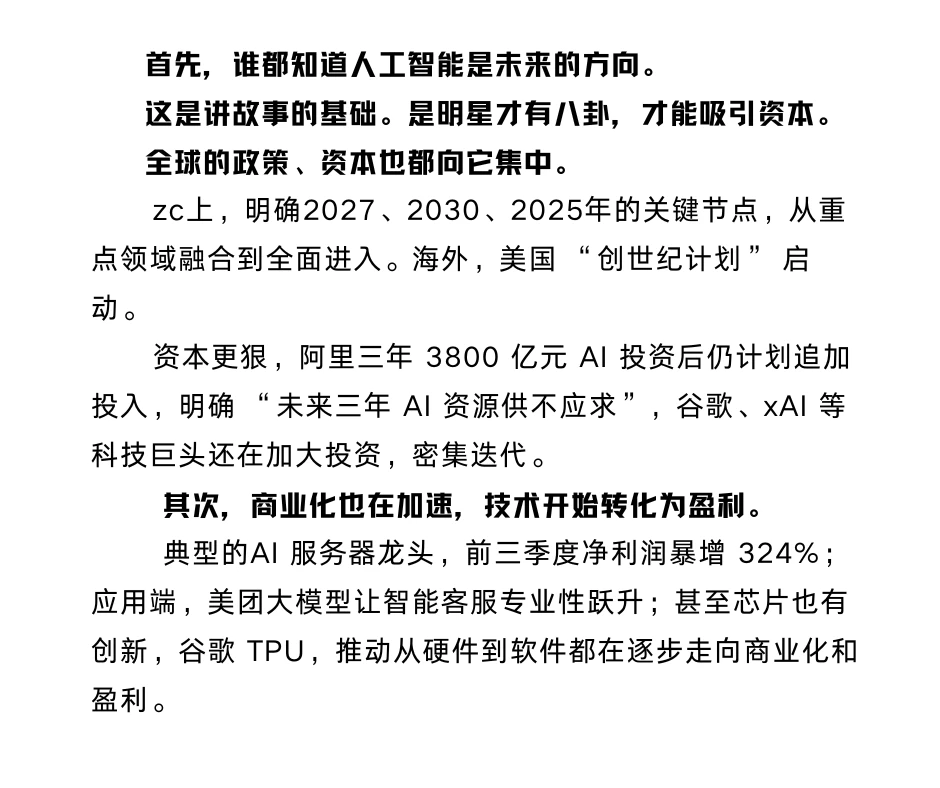 典型的AI 服务器龙头,前三季度净利润暴增 324%;应用端,美团大模型让智能客服专业性跃升;甚至芯片也有创新,谷歌 TPU,推动从硬件到软件都在逐步走向商业化和盈利。