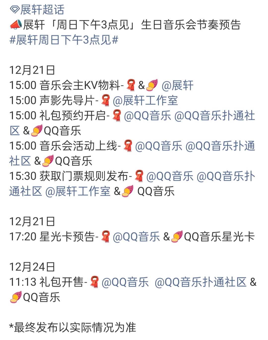 展轩生日音乐会展轩「周日下午3点见」生日音乐会预告12月21日15:00KV物料-声影先导片-礼包预约开启-活动上线,15:30门票规则,17:20 星光卡预告!24日11:13 礼包开售!展轩生日音乐会官宣