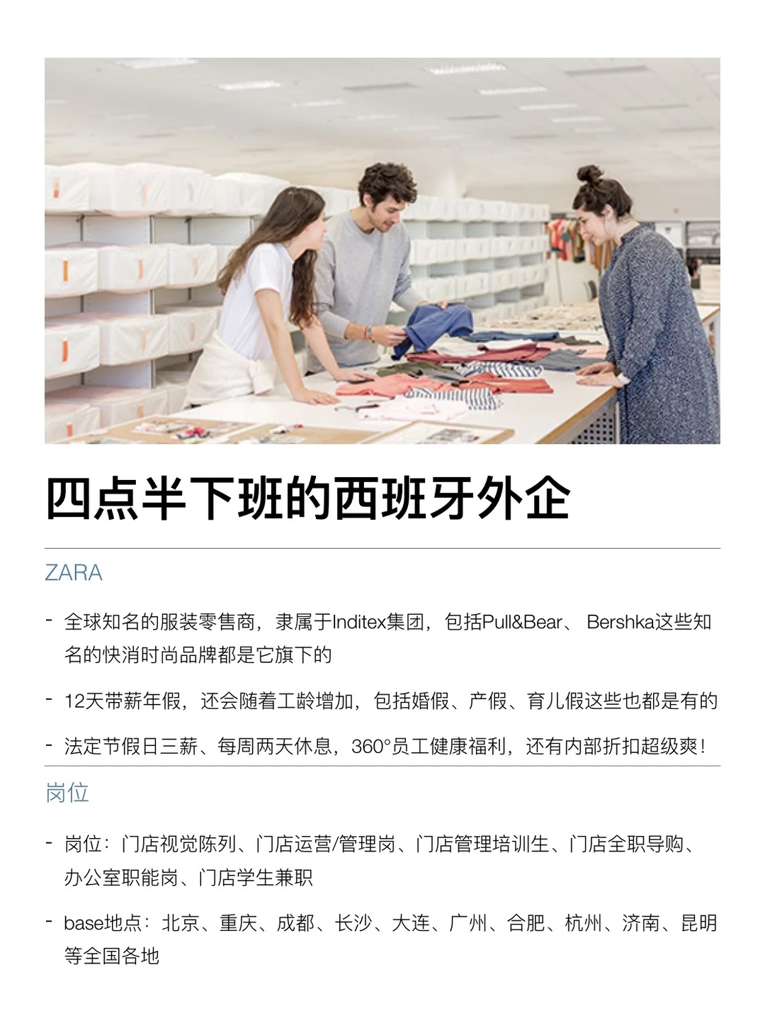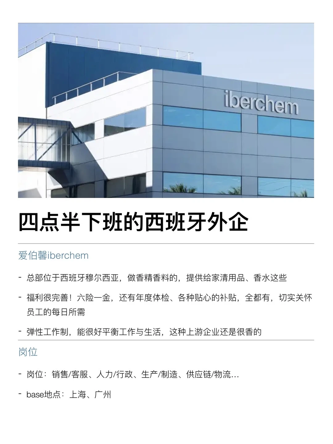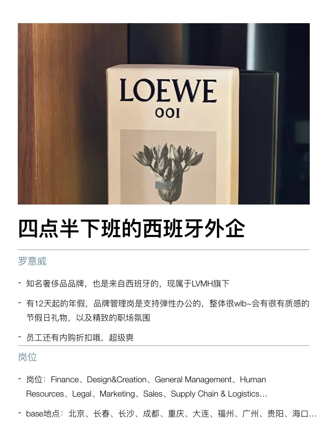 感觉很少有人整理西班牙外企诶,但其实大家每天吃的、穿的、用的,很多都是板鸭的。包括这次整理的 ZARA、罗意威、爱伯馨,还有高乐高其实都是西班牙的 . 西班牙外企也都蛮香的,节奏更慢、更松弛、更看重生活。工作时间里把事做好,下班就是真的下班,不太鼓励无意义加班,说“四点半下班”其实指的就是不卷、准点走 . 福利这块也挺实在的,大多都是 955 双休,年假起步不低10天起,员工折扣、内部福利都很完整,整体氛围友好,对女生也比较友好,是真的能实现wlb . 最近有找工作打算的,真的可以去试试,蛮香的 . 坚持日更✊🏻,对外企感兴趣的欢迎常来看看 .