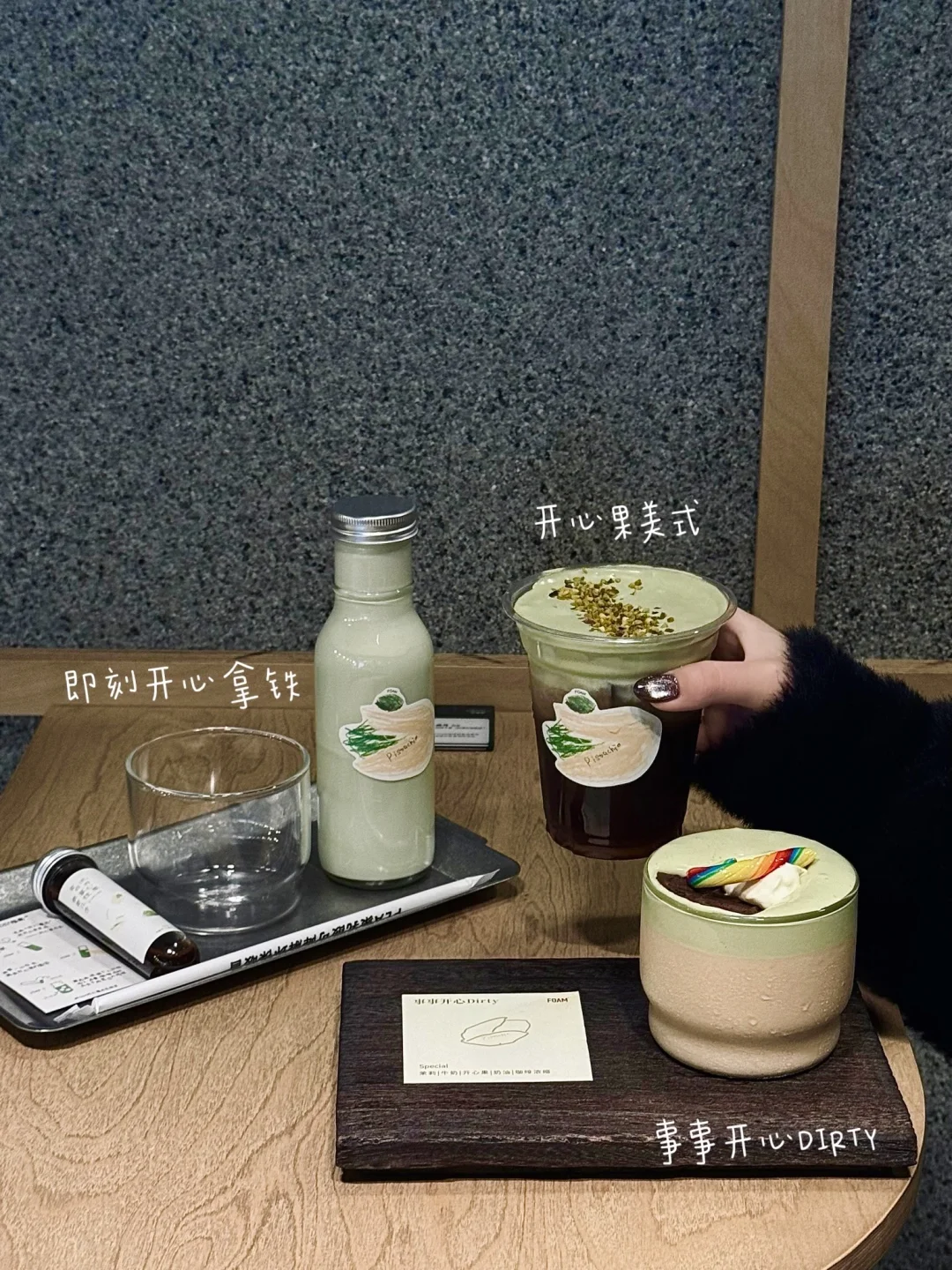 先说这杯事事开心dirty!! 层次丰富 甜度口感都平衡得很好 开心果脑袋都给我去喝好吗!真的爆炸好喝! 喝完真的会开心一整天啊啊啊!!!!! 点的其他两杯也都很喜欢~ ▪️即刻开心拿铁 可以自己diy很有趣 建议先喝开心果牛乳 再加咖啡液 整体是偏清爽的口感 ▪️开心果美式 浓郁的开心果奶盖搭配冰美式 既能感受到开心果的香浓 还能喝到咖啡本身的苦感 不甜不腻~打工人必备 - 这家店环境也很不错 适合办公或者下午茶