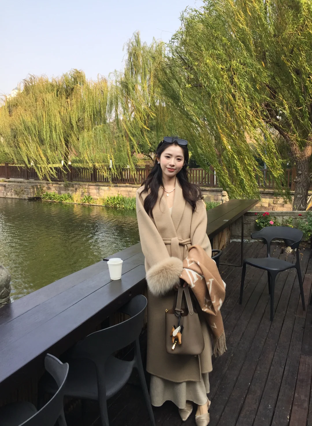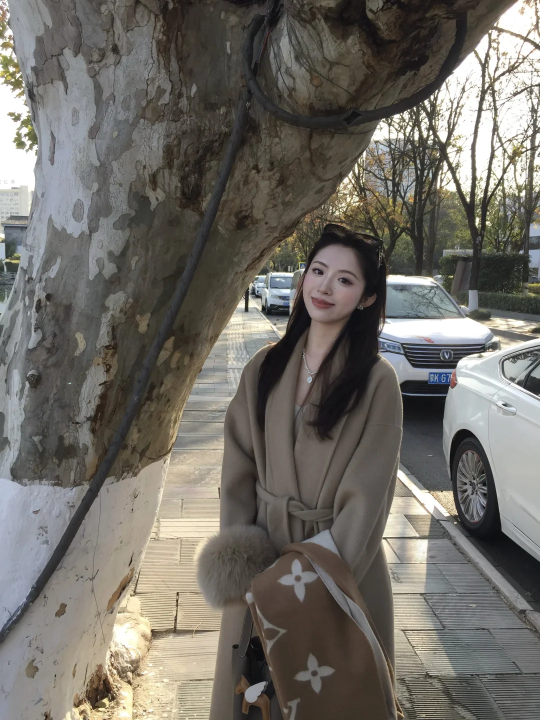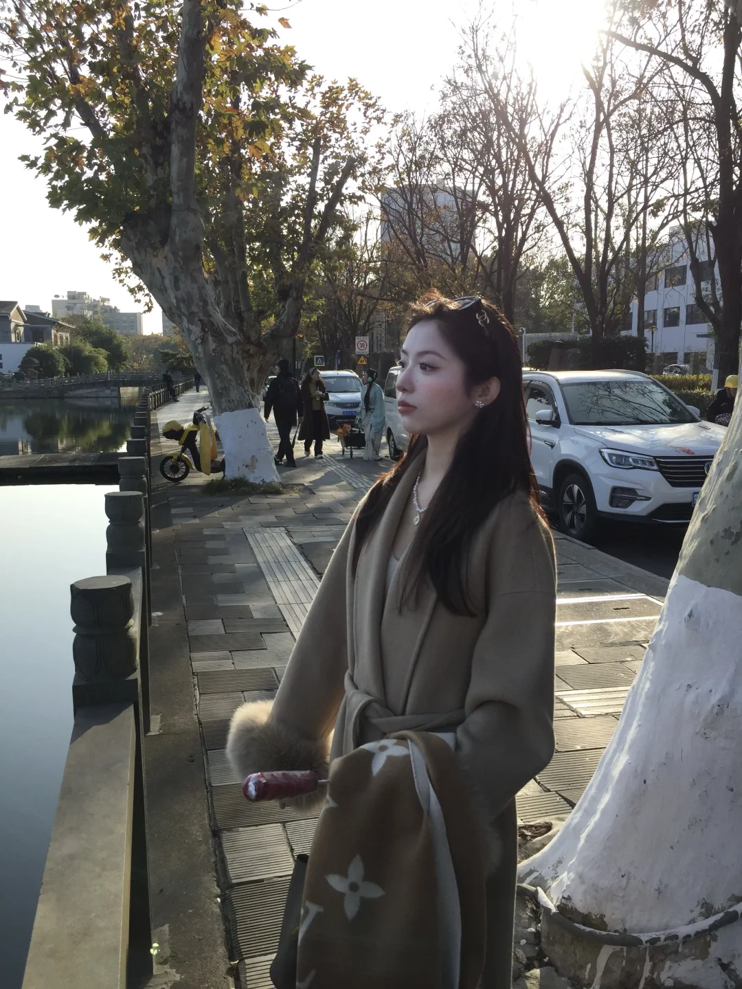 浅驼色大衣的浪漫 与湖水垂柳撞个温柔的满怀