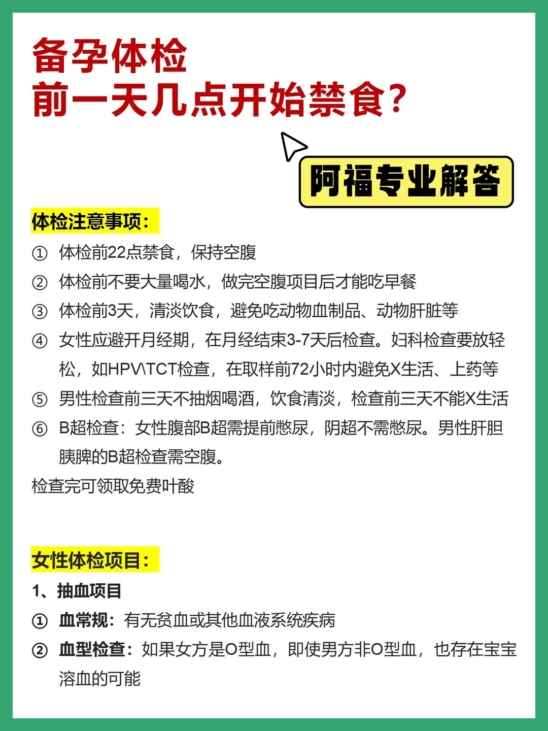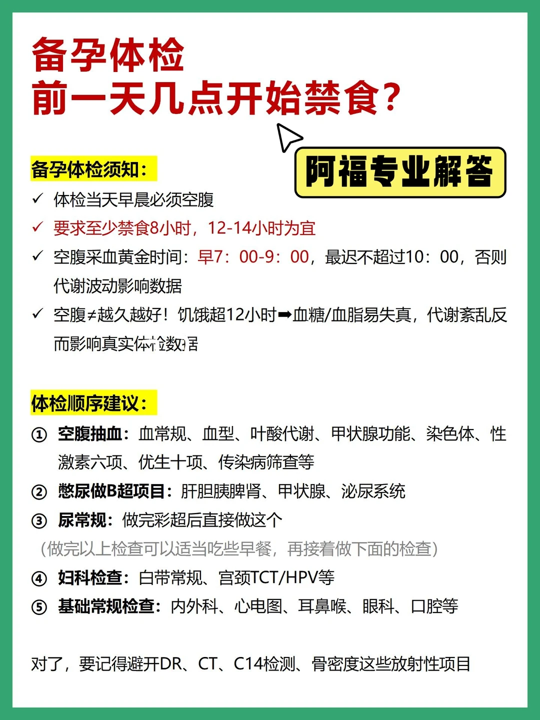 不得不说,阿福真得有两把刷子‼️问他【备孕体检前一天几点开始禁食】,他不仅会告诉我们禁食开始时间、空腹时长,还会告知检查注意事项,像女性要避开月经期,月经结束3-7天进行检查,男性要禁欲2-3天~