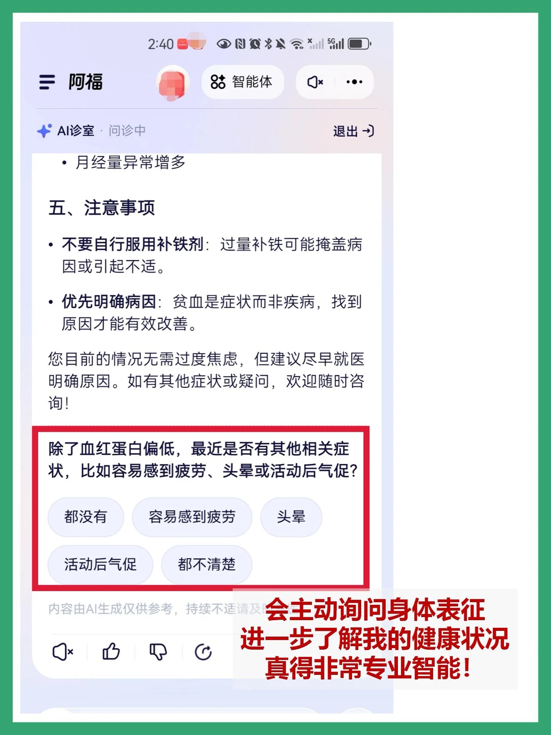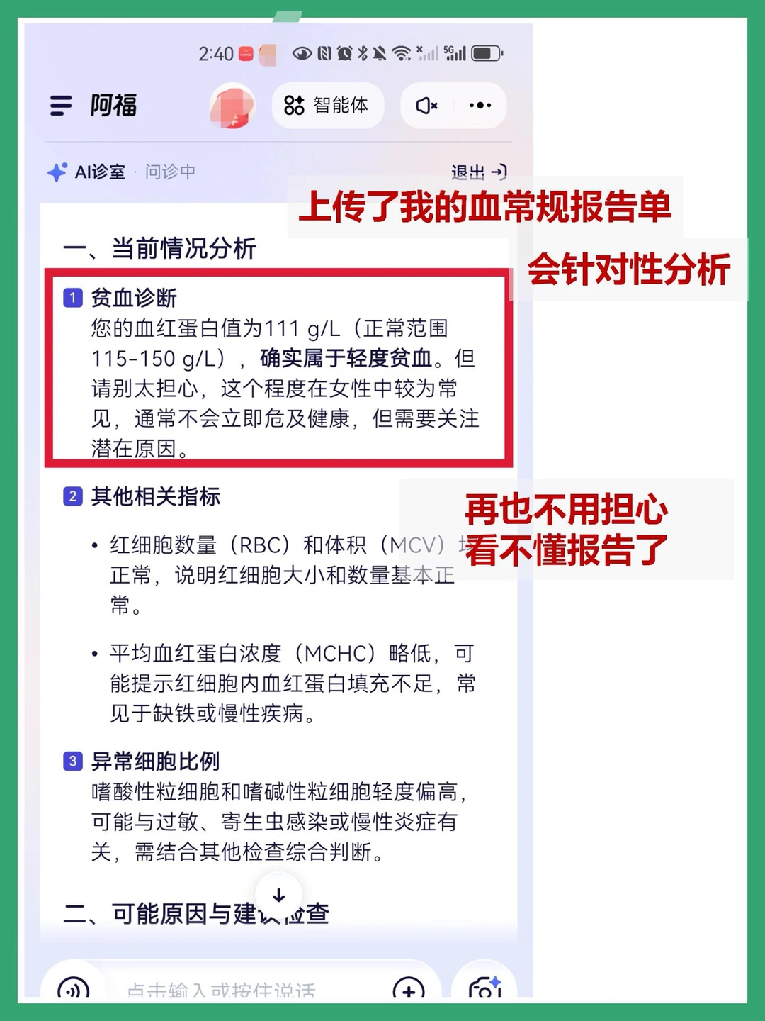 检查后,我在后台上传了血🩸常规报告单,阿福还会做出报告分析,甚至会主动追问你的身体表征,进一步判断健康状况,全能‼️
