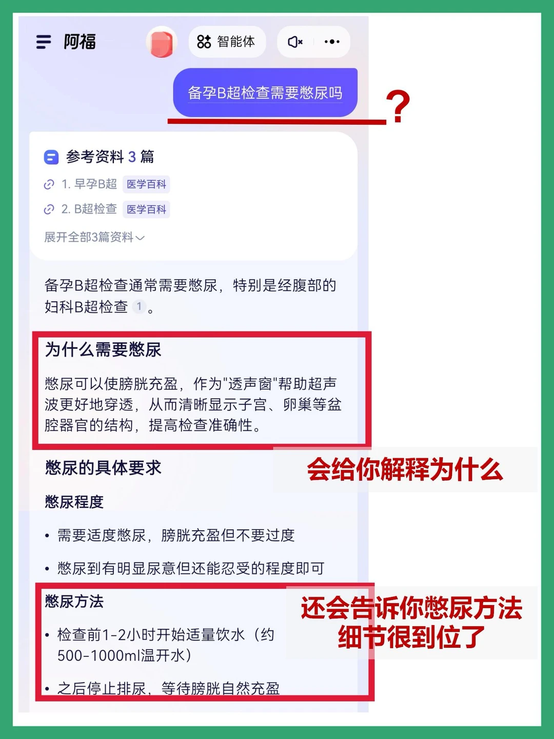 在我问到【备孕B超需要憋尿吗】,除了告知你是否憋尿和原因外,也会给出明确的憋尿方法,贴心❤️~
