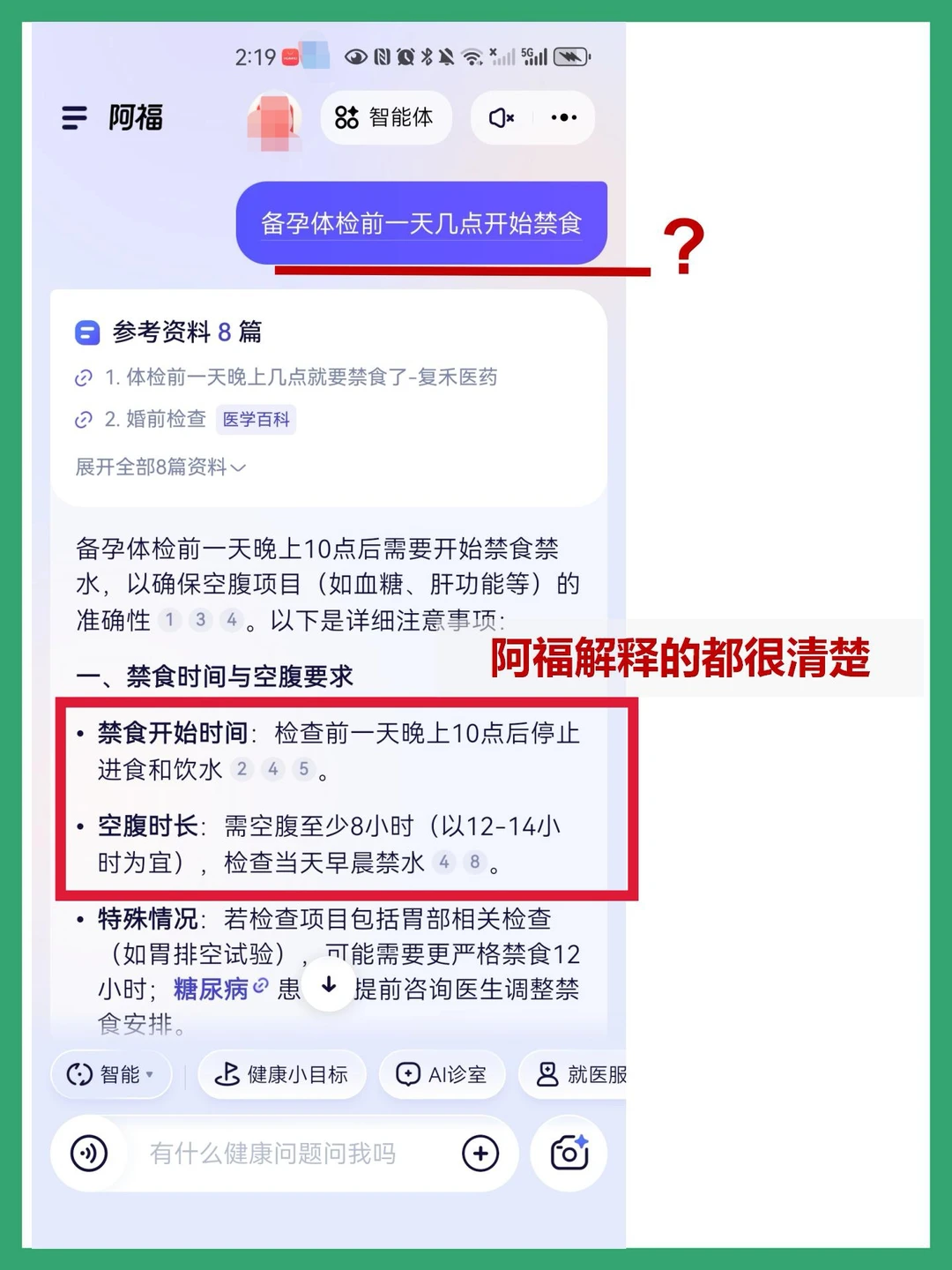备孕中的健康问题已经习惯了问阿福这个健康AI~ 新问题又来了,体检前一天几点开始禁食?继续招阿福要答案~