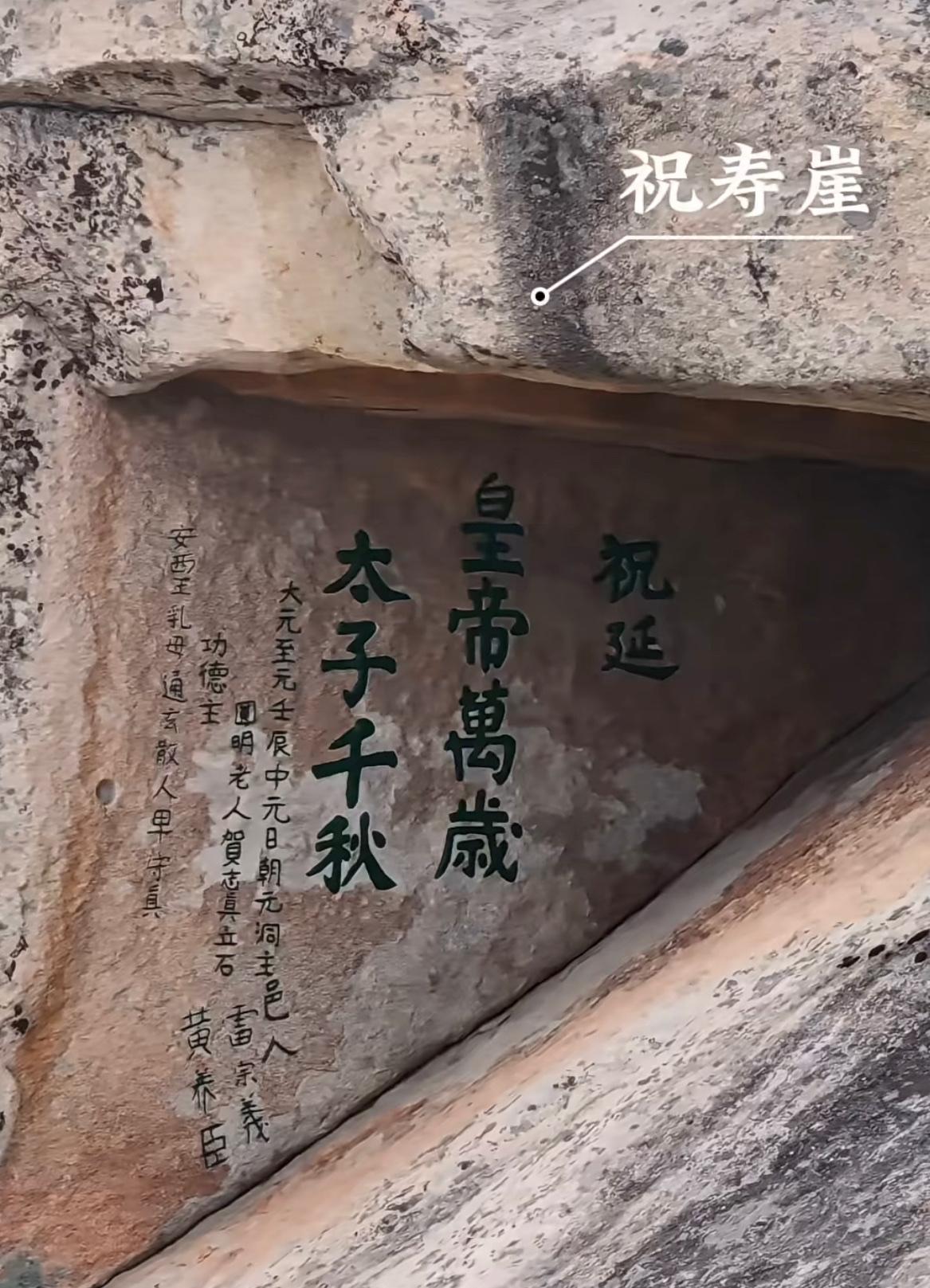 华山长空栈道上方悬崖千仞处的祝寿崖。 元朝至元年间(元世祖忽必烈在位期间),道士贺志真题刻“祝延皇帝(忽必烈)万岁,太子(真金太子)千秋”,笔墨嵌于绝壁,与险峰相融,一直完整保存到今天。 石崖刻字 华山 元世祖忽必烈 文物