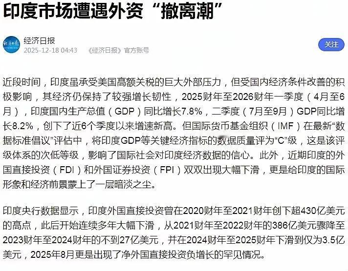 印度这波外资大逃亡,比孟买雨季的洪水还汹涌!FDI从近百亿美金暴跌到3.53亿,跌幅96%,这哪是撤资,简直是资本集体大撤退!股市被抽走170亿,莫迪喊的“印度优先”彻底哑火! 说到底,印度就是得了“既要又要”的病——既想赚全球化的钱,又怕被外资控制,反手就“割外资韭菜”。亚马逊、沃尔玛被罚到哭,小米48亿资产冻结三年,苹果刚挨41亿税单,这哪是做生意,分明是交保护费! 更绝的是印度式GDP注水,3.9万亿的账面数字得砍半看;首富儿子结婚花43亿请明星,贫民窟却越扩越大;种姓制度根深蒂固,工会动不动烧工厂,外资来这儿就是闯龙潭! 莫迪靠印度教民族主义凝聚人心,反倒吓跑了外资。土地征用难、劳工法苛刻、法律选择性执法,外资在这儿就是待宰的猎物! 最后说句实在的,印度再不放下零和思维,迟早成资本荒漠。谁愿意把钱投到杀鸡取卵的地方?竭泽而渔的尽头,只能是自焚!