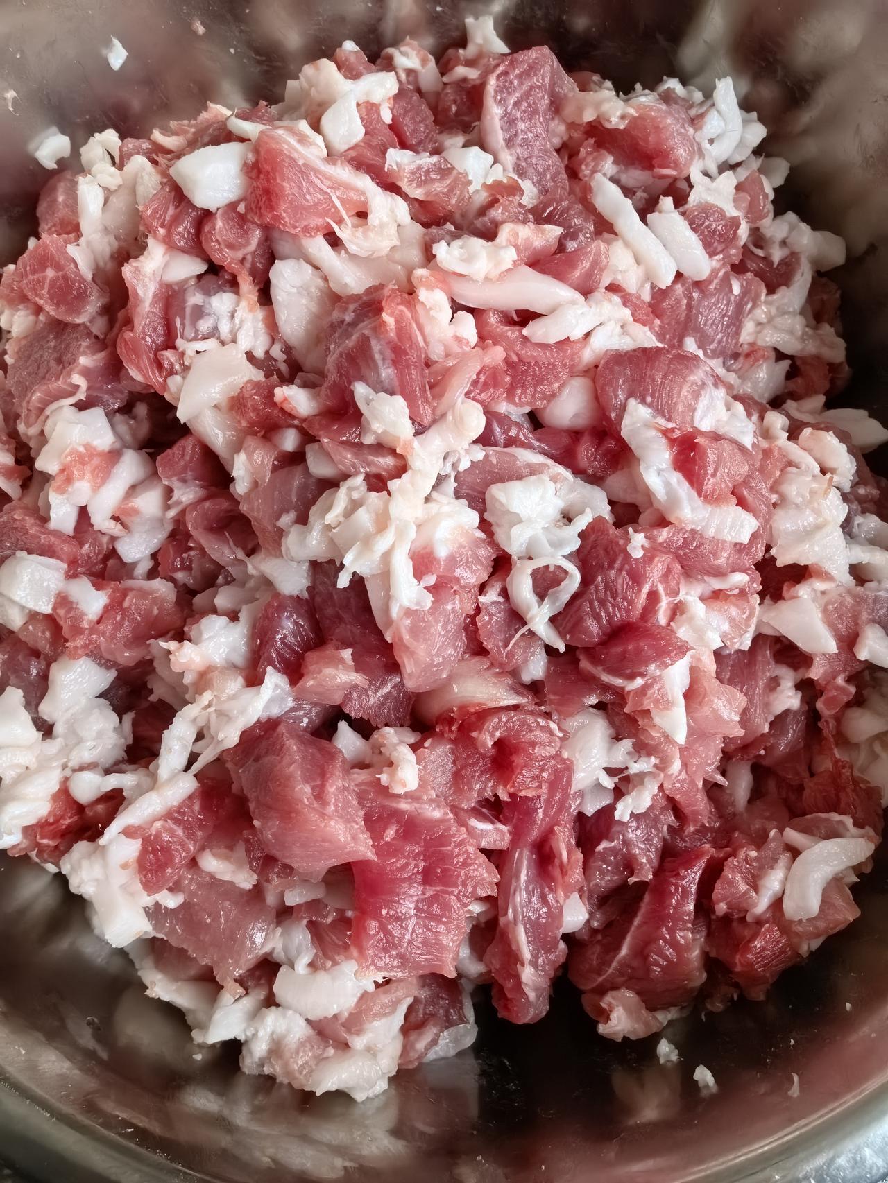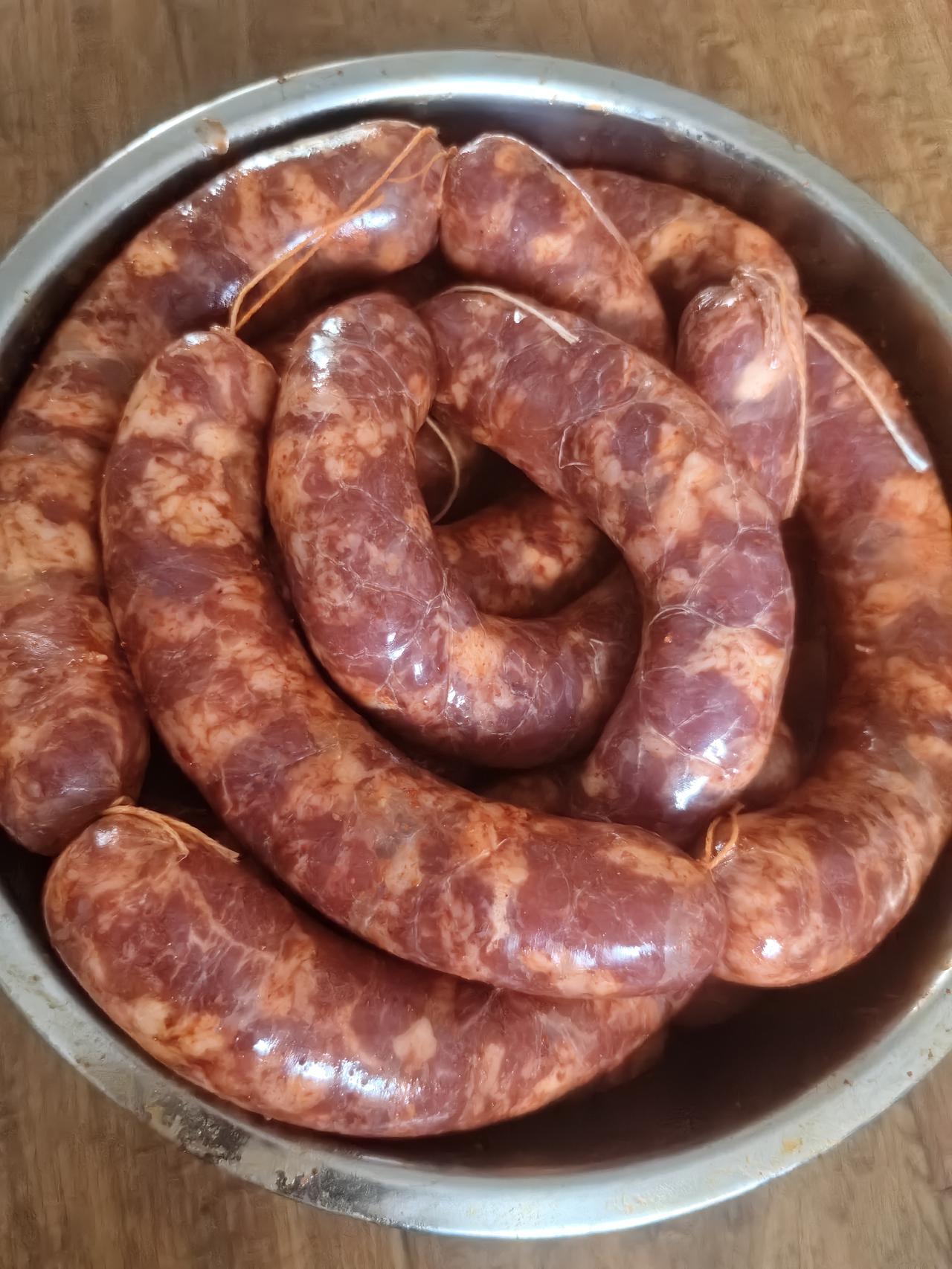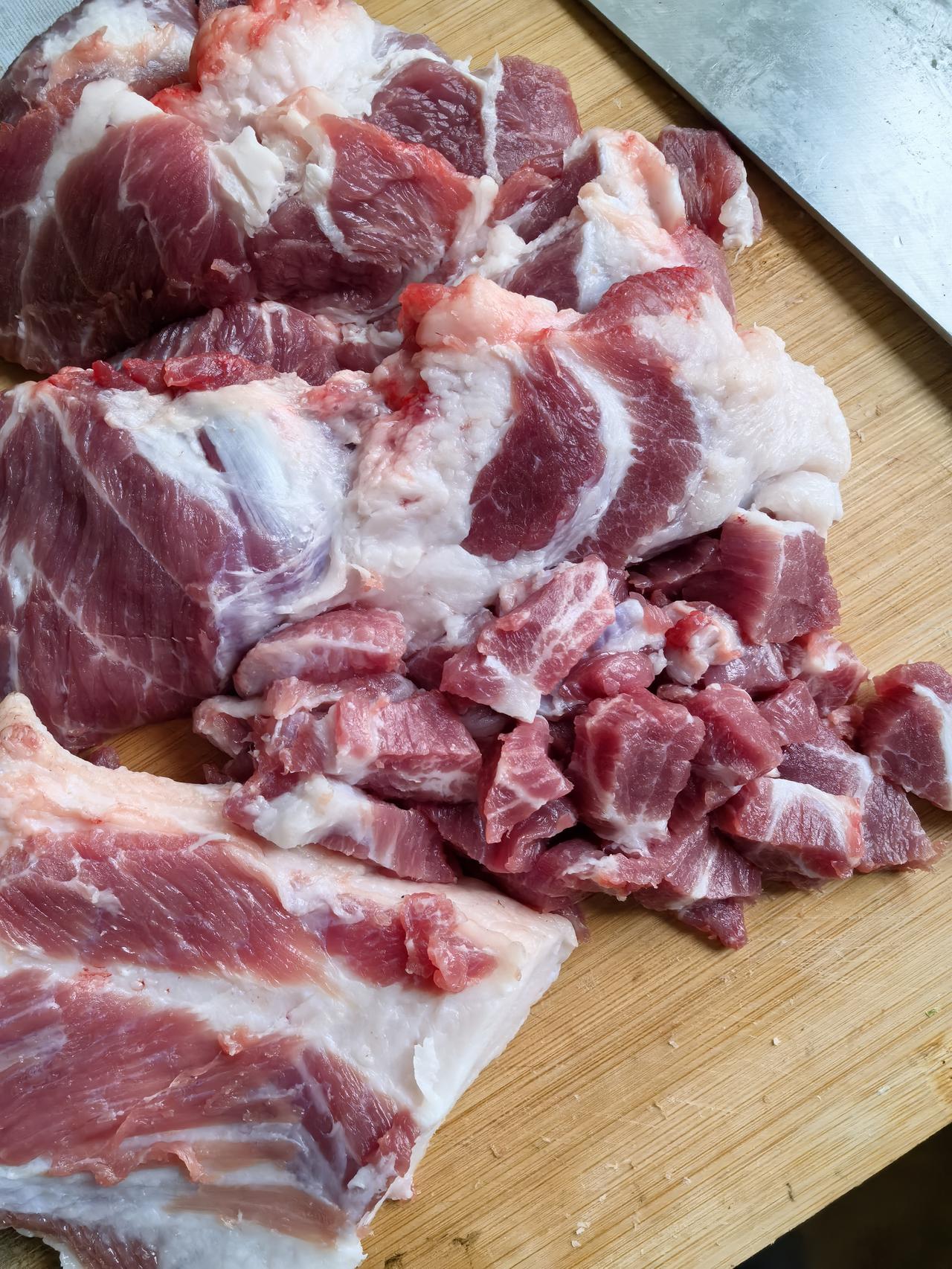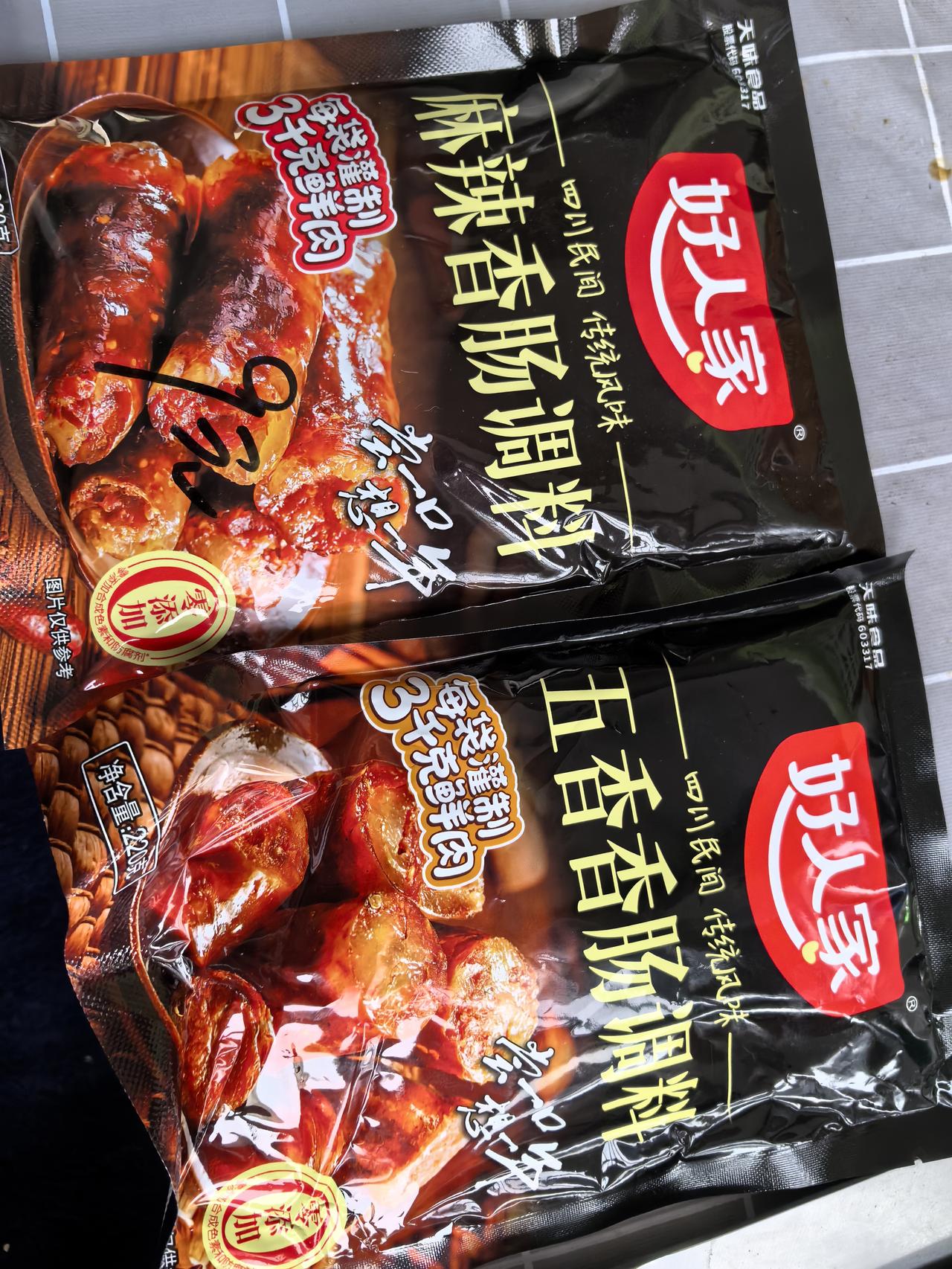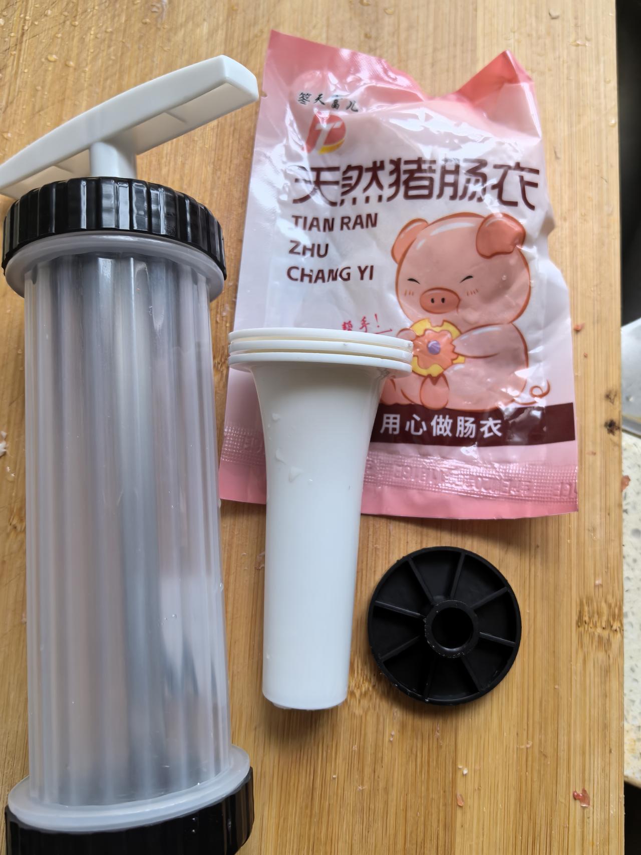 您家香肠灌了吗? 前两天群里看友友们都在置办年货灌香肠晒腊肉,我也开始蠢蠢欲动。 在直播间抢了一个灌香肠神器,还送的有两包肠衣和十根棉线,然后又买了两包“好人家”牌子的香肠调味料,一包麻辣一包五香味的,产地都是四川的,味道应该错不了。 之前打电话问妈妈,她说气温还高呢,灌早了不好吃。襄阳今日降温了也进入农历冬月间,逛西湾狗市,见很多人买肉灌香肠,我也买了十斤肉,主要是昨天在网上淘的灌香肠的工具到货了,检验一下是不是真如广告说的那么好使。 让老板帮忙把皮去掉称重共十斤,这样方便放调味料。买的前夹肉,9.5元一斤,您那里前夹肉多少钱一斤呢。 回家稍微把肉表面冲了一下水,用厨房吸水纸把水吸干开始切肉。因为毛孩子途途害怕绞肉机绞肉的声音,今年我就用刀切的肉,肥肉瘦肉分开切成了小颗粒的肉丁。 再把送的肠衣反复冲洗干净,送的肠衣一共有六段,应该不够六米,不晓得够不够灌十斤肉,有点悬。 一切准备就绪,把肉分了两份,一份灌麻辣味道共计六斤肉,一份灌五香味差不多有四斤肉,仔细看了说明,一袋调料可以灌六斤肉,那五香味的那份就用不完那么多调味料。 把肉和调味料拌匀后让它入味两个小时,开始洗灌香肠神器,然后给自己和途途简单做了午餐,吃完再收拾完后,开始灌香肠。 我家年货每年都是我一个人完成,我妈妈电话遥控指挥,今年我就省了打电话请教妈妈的步骤。把洗干净的肠衣套在灌香肠神器的管子上一头系上绳子,把肉装进罐体里,拧紧,就开始跟打针一样使劲按压,突然发现,用肚子顶比用手按压还方便操作些。 不一会功夫,就把两盆肉灌得差不多了,还剩近两斤肉没有灌成,因为肠衣不够了。不得不评价一下,这个灌肠神器确实比单纯的塑料管子好用,灌香肠快多了。整个产品质量还可以,密封圈性能不错,就是送的肠衣质量不行,破的多,还少,没有广告说的能灌十斤肉。早知道我应该在市场上多买一包肠衣备着,不然这拌好的肉没法处理,恼火哦,明天还得跑一趟菜市场。 听卖肉老板提醒,香肠不要在太阳下暴晒,最好挂屋檐下阴干,等肠衣萎缩了就收起来,这样的香肠好吃。 友友们,那就再等一段时间,等香肠可以吃了,我再评价一下购买的“好人家”香肠调味料味道如何。 请问一下会做腌制食品的友友,你们灌香肠怎么放调味料?腌五花肉的方法是什么?我前几天用酱油泡的五花肉味道还行,网上卖的腌制五花肉的调料味道行不行啊?