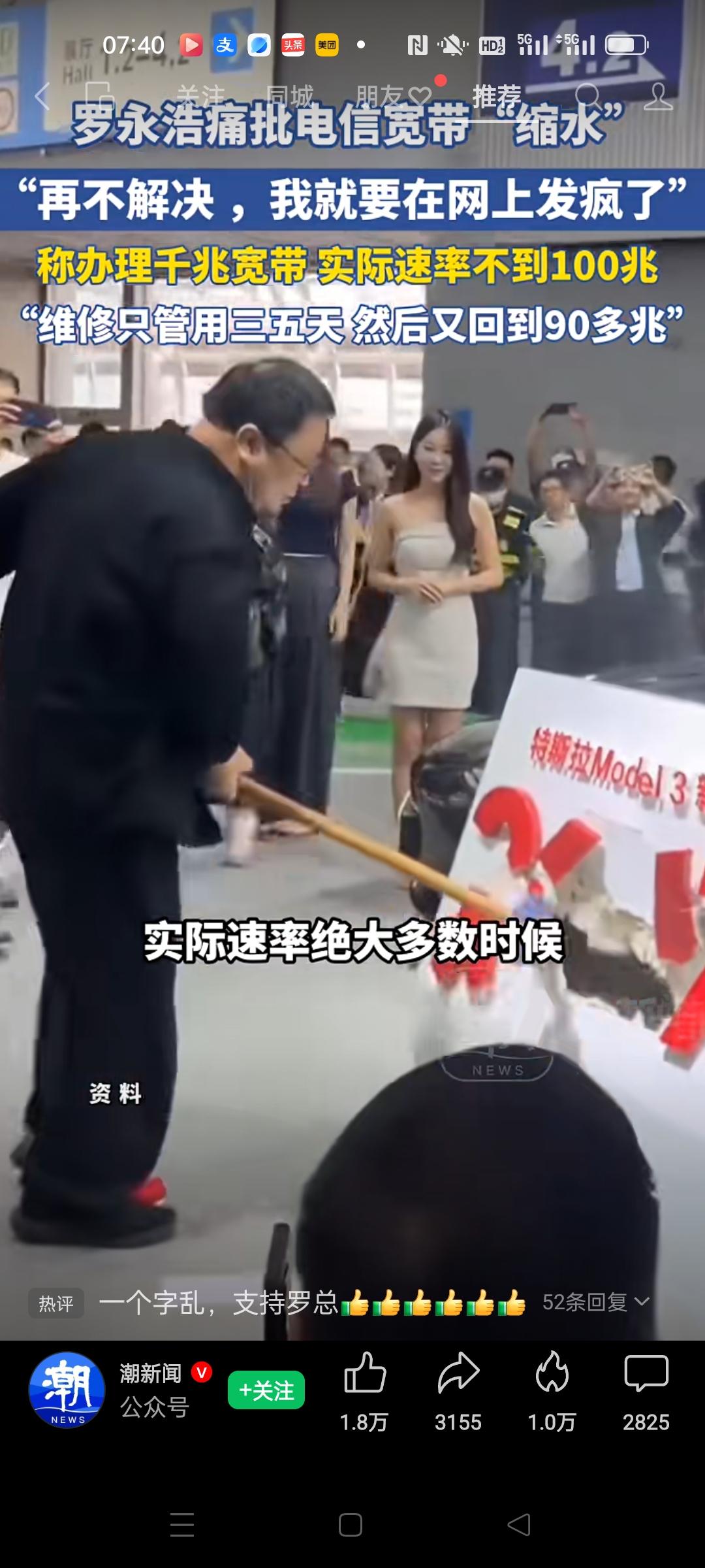 罗永浩怒批电信宽带缩水,自己办的千兆宽带,实际带宽不足100兆。找客服维修后,只管用二三天,又降到90兆。这种与承诺不符的情况,严重惹怒了罗永浩,声称再不解决,就要在网上发疯。 反正与罗永浩作对的没一个有好下场,劝电信惹谁都行,千万别惹罗永浩,赶快把他问题解决了