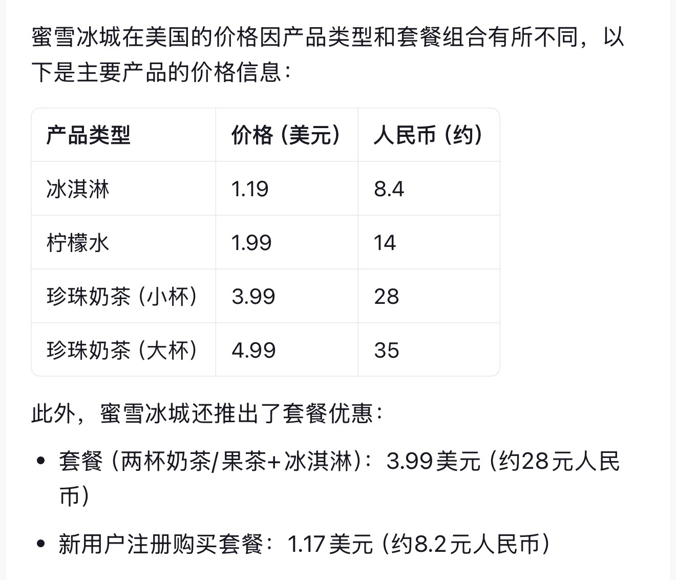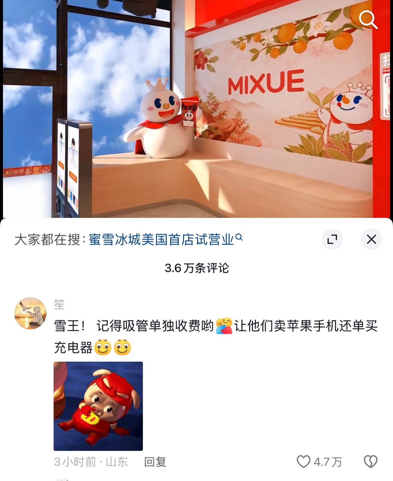 啊?蜜雪冰城在美国开店了?冰鲜柠檬水 1.99 美元,甜筒 1.19 美元,两杯喝的➕一个冰淇淋,3.99 美元,简直是爆杀?网友还说让喜吸管单独收费, 因为 iPhone 不送充电器……
