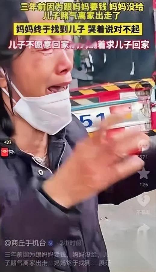 3年前的一句话,隔了母子3年。 儿子要钱时妈说“没钱”,他摔门走了,这一走就是1000多个日夜。 等找到他时,妈哭着拽他袖子:“跟我回家”,儿子站在那儿,脸冷得像结了霜。直到妈“扑通”跪在地上,攥着他衣角重复“我错了”,周围人都跟着难受——可错的哪儿是“没钱”?是俩人事到临头都憋着半句话没说。 妈没说“没钱”那天,是刚交了房租,冰箱里只剩两颗蔫白菜;儿子也没说,那次要钱是想给妈买件能裹住肩膀的棉服——就因为这半句没出口的“真心话”,最亲的人愣是成了最陌生的人。 咱普通人家的亲情,哪经得住这种“猜来猜去”?妈觉得“我吃的苦不用跟孩子说”,儿子觉得“你不满足我就是不爱我”,可裂痕都是从“话到嘴边咽回去”开始的。 亲情里最金贵的,从来不是啥都顺着来,是坐下来好好说句“掏心窝子的话”。妈得学会把“难处”说出口,儿子得学会把“心意”讲清楚——毕竟,俩人心贴在一起,比啥“满足”都强。 你们有没有跟爸妈没说透的“半句话”?比如某次吵架,其实你是想递杯热水?评论区聊聊,说不定今天就能给爸妈发条消息,把那半句补上——别等3年,才懂“说开”比“憋着”强。