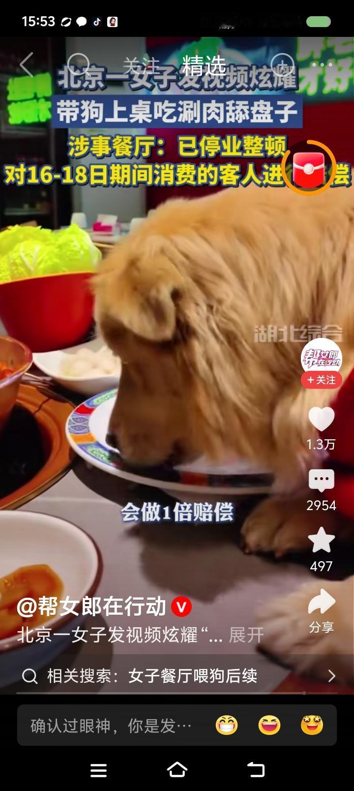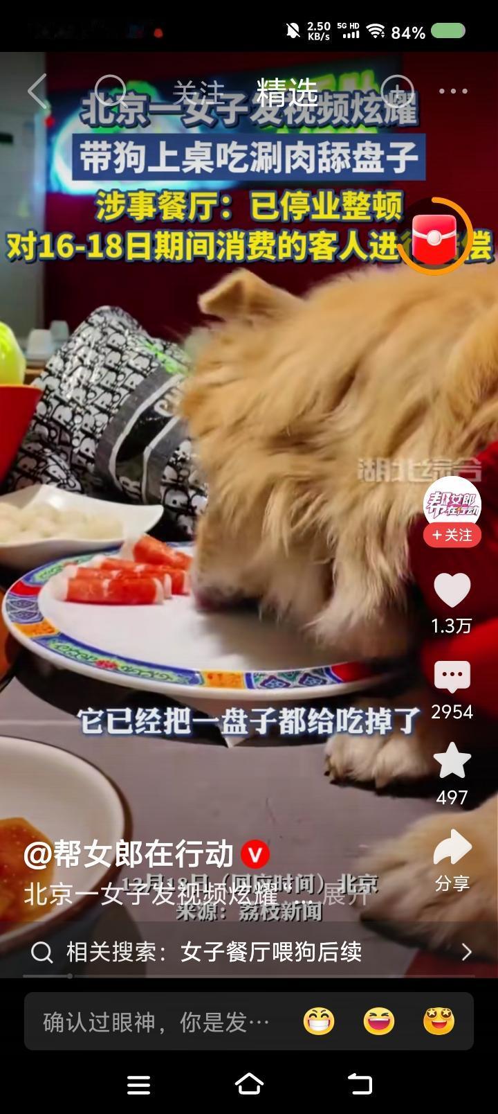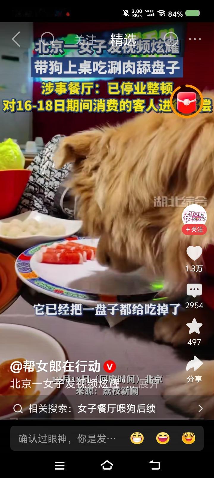 带狗“上”饭店的桌子吃饭?—— 据报道,一女子去饭店吃饭,带狗进去的。狗上了饭桌。女子发视频炫耀。 点评: 每当看到有人给狗穿上衣服,抱在怀里,“妈妈抱,宝宝乖”,我就不寒而栗。 一个人如果有钱,它可以买下一幢楼,养几百只狗…… 有这样的人吗?什么是人性?人性中是含动物性的。 溺爱狗,虐狗,是一个事物的不同方面。看起来是两个极端,但扭曲成了一个环。