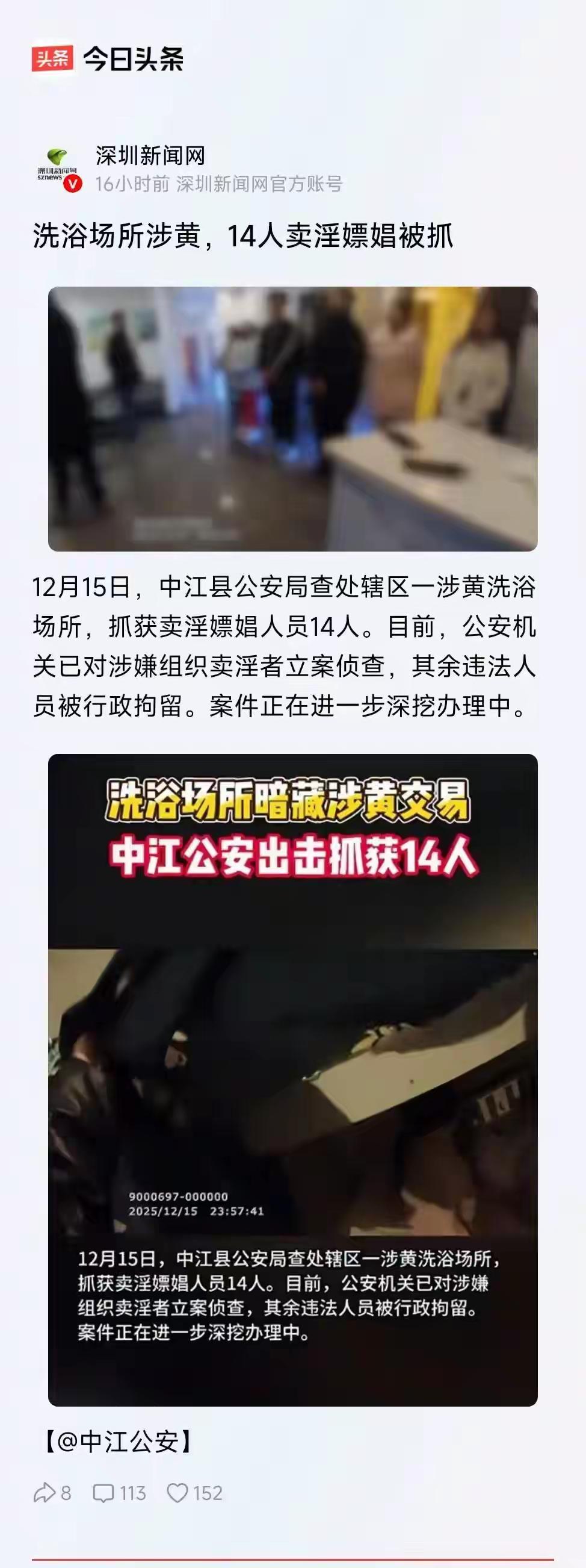 四川德阳中江洗浴中心深夜被端,14人衣衫不整被抓现场曝光!网友怒问:为何总有人铤而走险? (来源:综合深圳新闻网、中江公安及网络热议) 夜色下的中江县城,一家看似普通的洗浴中心灯火通明。谁也没想到,就在这扇挂着“养生按摩”招牌的大门背后,正进行着不可告人的交易。直到警灯划破夜空,民警突击进入,现场一片慌乱。衣服散落一地,14名男女在震惊中被带走。这一幕,就发生在12月15日的四川德阳中江县。 消息一出,瞬间引爆网络。有人拍手称快,认为警方干得漂亮;也有人陷入沉思,为何在法律法规如此明晰的今天,仍有人前赴后继地踏入同一条河流?这不仅仅是一次简单的治安处罚,更像一面镜子,照见了人性深处那些隐秘的角落。 我们不得不问,到底是什么让这些人铤而走险?是为了快速获取金钱的诱惑,还是为了填补内心空虚的刺激?或许两者皆有。但无论是哪一种,他们都选择了一条最危险的路。法律的红线就摆在那里,一旦触碰,付出的代价远超想象。行政拘留、高额罚款,还有伴随一生的污点记录。 更令人深思的是,这条灰色产业链的源头何在?那些隐藏在幕后的组织者,才是真正的毒瘤。他们利用他人的困境或贪欲,将肉体明码标价,把场所变成非法交易的温床。对他们而言,这只是一门生意;但对社会而言,这是对公序良俗的粗暴践踏。警方的深挖彻查,正是要斩断这只黑手。 翻看网友的评论,情绪更加复杂。一条高赞留言写道:“比起这些,我更希望看到对贪污腐败的严厉打击。”这句话获得了上千点赞。它折射出公众的一种普遍心态:对权力滥用的痛恨,有时甚至超过了对街头违法行为的关注。这种比较本身,就值得整个社会深思。 另一条评论则带着无奈的幽默:“有人说,这是赶在过年之前,让她们早点回家相亲。”笑过之后,却感到一丝悲凉。如果回家团圆的路,需要以这样的方式被“推动”,那背后的社会经济与个体生存压力,是否值得我们投以更多的关切与疏导? 当然,压力从来不是违法的借口。任何社会都有其运行的底线规则。我们同情个体的困境,但绝不意味着可以纵容违法行为。警方的这次行动,正是对社会底线的一次坚定捍卫。它告诉所有人:无论什么理由,法律尊严不容挑衅,道德底线不容侵蚀。 从更广阔的视角看,每一次扫黄打非,都不只是清除社会污垢,更是一次价值观的公开宣示。它重申了何为对错,何为荣辱。一个健康的社会,不仅需要法律的外在约束,更需要公民内心的道德律令。当越来越多的人从心底里认同诚信、勤劳与尊严,这些黑暗角落才会自然消散。 作为普通人的我们,并非无能为力。举报违法行为,是公民的责任;树立正确价值观,是家庭的功课;营造清朗环境,是社会的共同目标。当我们每个人都成为一束光,黑暗就无处藏身。这起案件应该成为一个警示,提醒我们时刻自律,也提醒我们关爱身边可能迷失的人。 社会警示 法律底线
