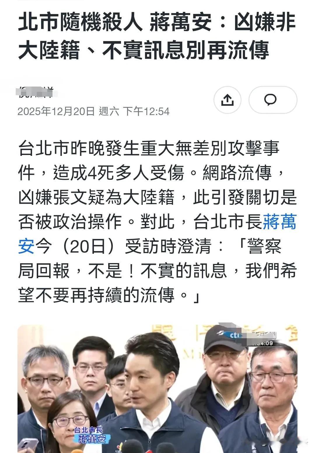 绿媒炒作台北随机攻击案嫌犯系大陆籍 蒋万安:不实消息 请立即停止传播 2025年12月20日,台北市市长蒋万安就19日晚发生的重大随机攻击事件召开维安应变会议并对外说明。针对网络流传的“嫌犯张文为大陆籍”的不实信息,蒋万安明确澄清,警方已证实该说法不实,呼吁民众停止传播不实信息,相关案情以警方通报为准。 据悉,19日晚台北车站、捷运中山站周边及诚品南西店发生系列随机攻击事件,已造成包括嫌犯在内4死5伤的严重后果。会议上,蒋万安宣布台北市全面升级戒备,在各大商圈、人潮聚集地加派全副武装警力,特勤小组同步进驻重要商圈强化安保。针对捷运安全,他透露捷运公司已增加保全人力、加强巡逻并联动捷运警察,后续将评估是否进一步强化安检措施。 回应媒体提问时,蒋万安确认警方通报嫌犯系畏罪坠楼身亡,目前案件被认定为计划性攻击事件,具体细节由警方后续统一说明。 对于网友质疑警方办案积极性的问题,他表示相关情况将在警方记者会上完整披露。此外,蒋万安还提及,事件发生当晚已第一时间前往多家医院慰问伤者及家属,后续副市长期将继续跟进慰问工作,社会局等部门也已全面介入了解伤者状况。 案情发生后,台部分网友称根据嫌犯名字,推测嫌犯来自大陆,即便部分绿媒也在暗示有可能来自大陆,此次蒋万安亲自辟谣,格局还是不错的。