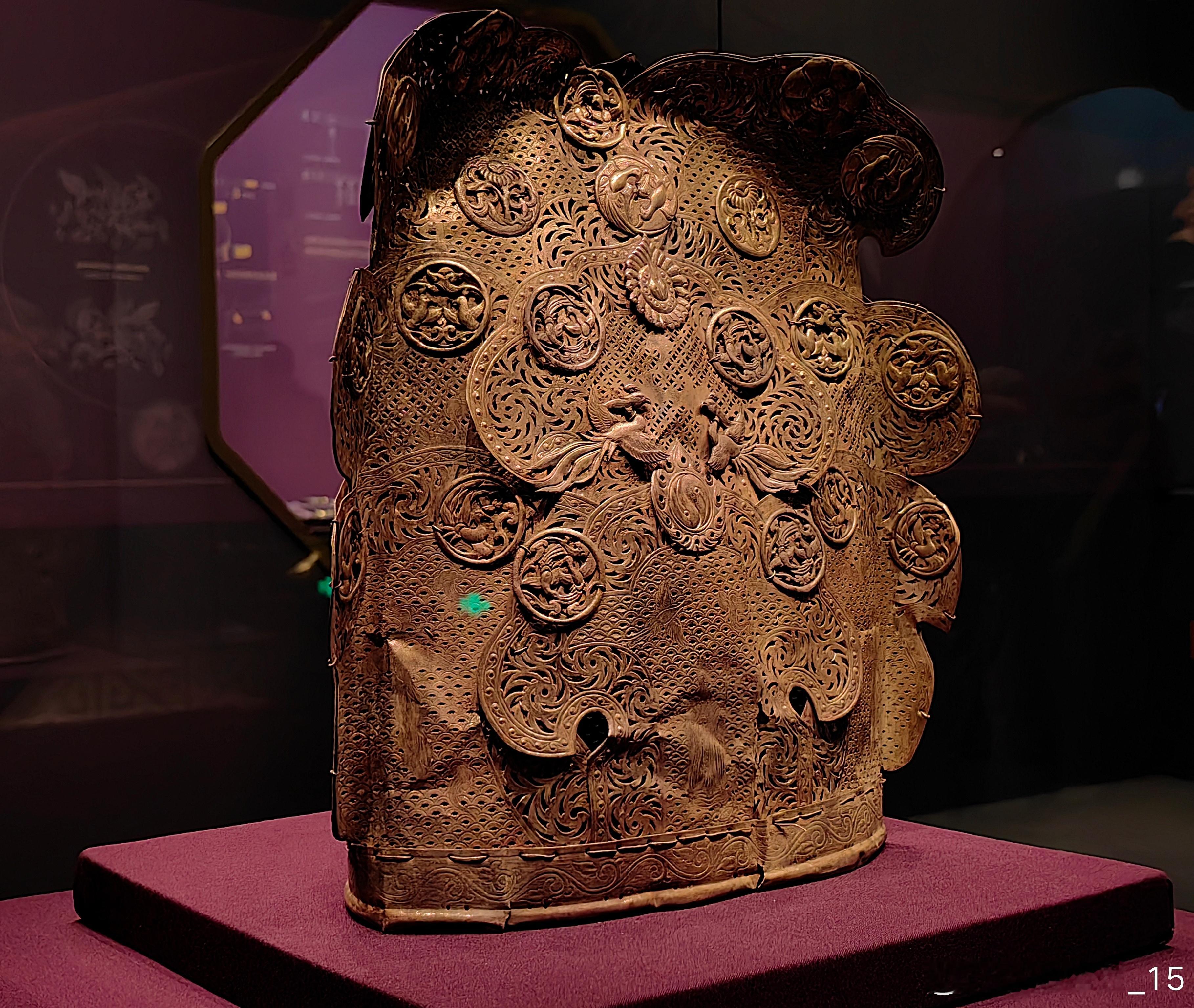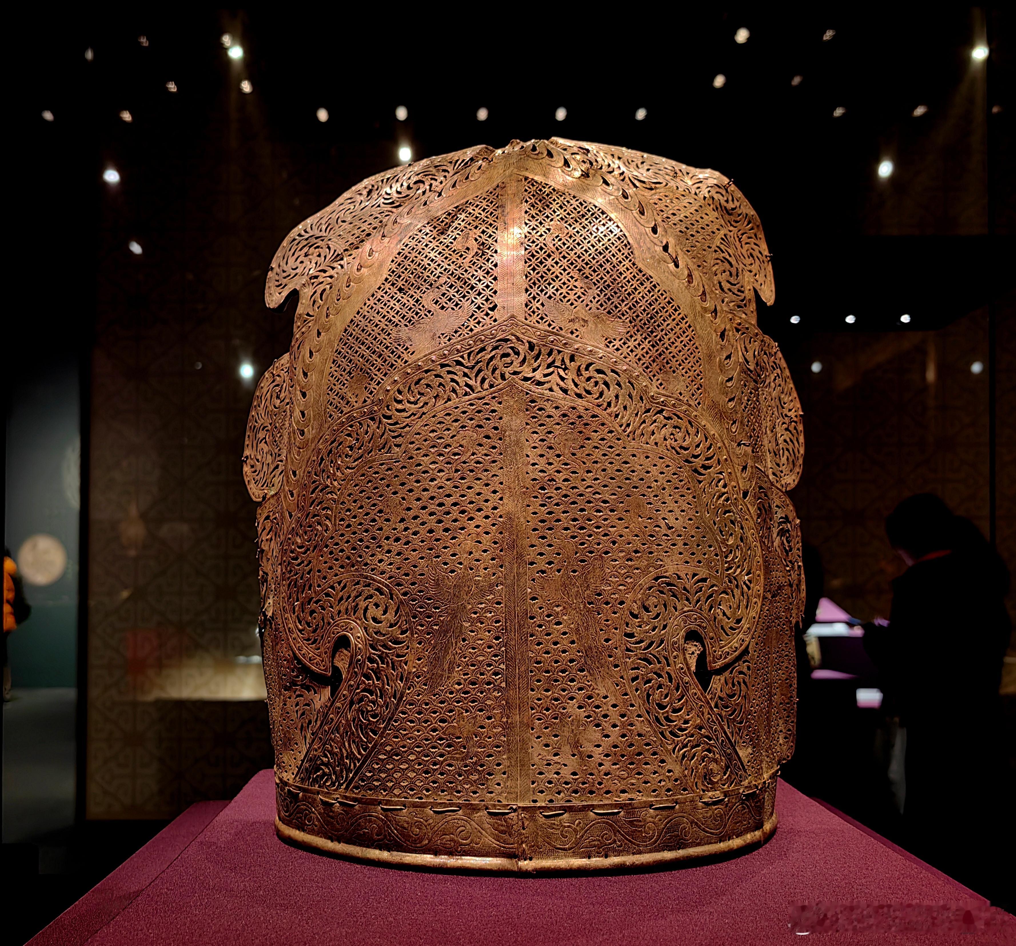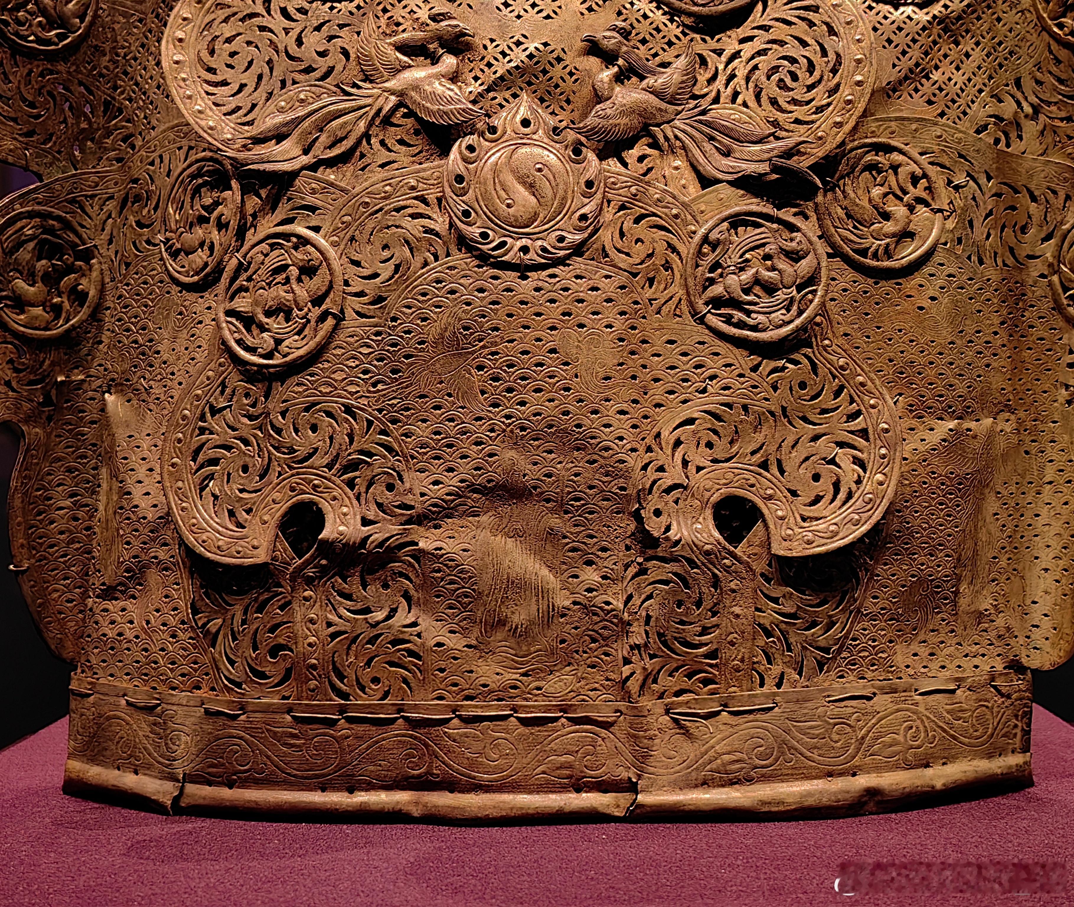 黄金缕-香港故宫文化博物馆藏古代金器 双凤戏珠纹卷云冠 | 辽(907-1125年)这是一件由十六片形状如云朵的镂空金属片连缀拼合而成的卷云金冠,上面还有二十二枚鎏金圆片,饰有菊花、鹦鹉、雁、飞鸟、太极图案。摄于首都博物馆2025.11.8