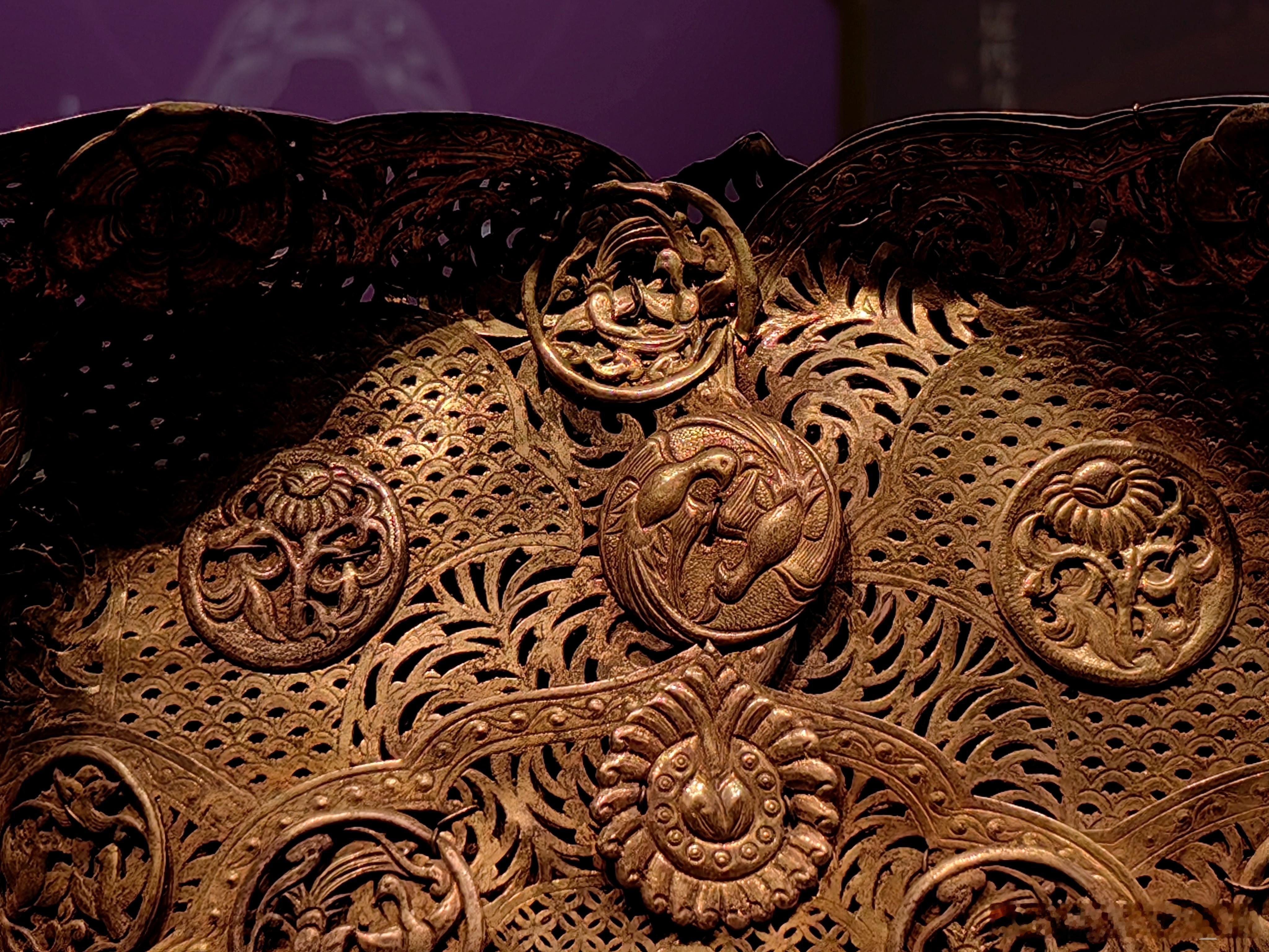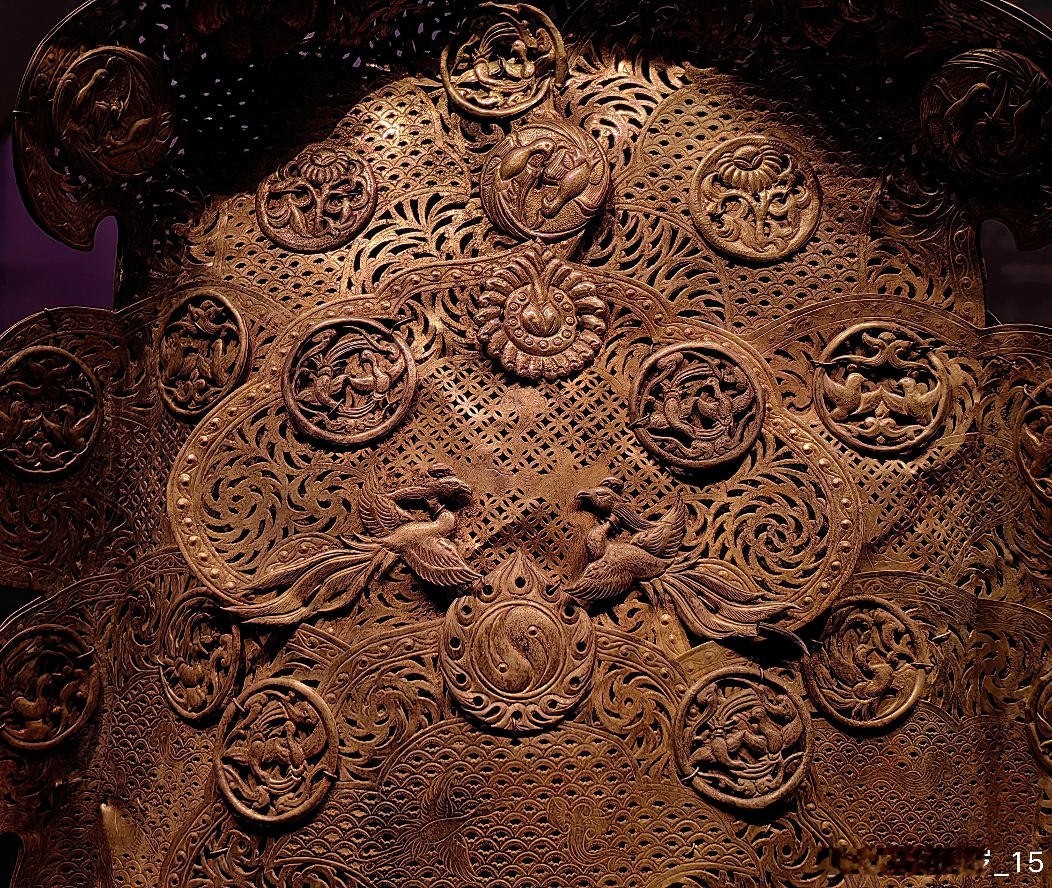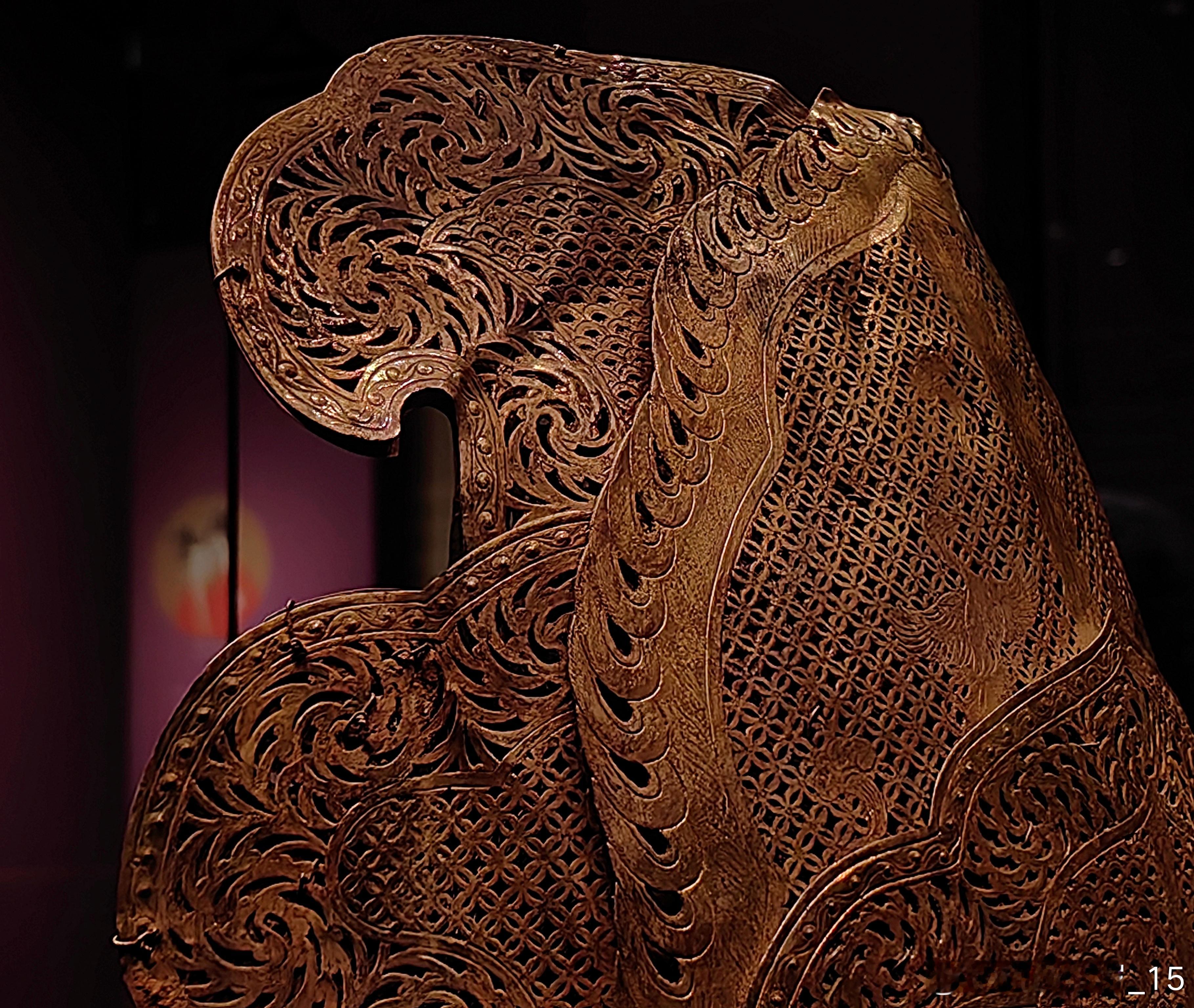 黄金缕-香港故宫文化博物馆藏古代金器 双凤戏珠纹卷云冠 | 辽(907-1125年)这是一件由十六片形状如云朵的镂空金属片连缀拼合而成的卷云金冠,上面还有二十二枚鎏金圆片,饰有菊花、鹦鹉、雁、飞鸟、太极图案。摄于首都博物馆2025.11.8