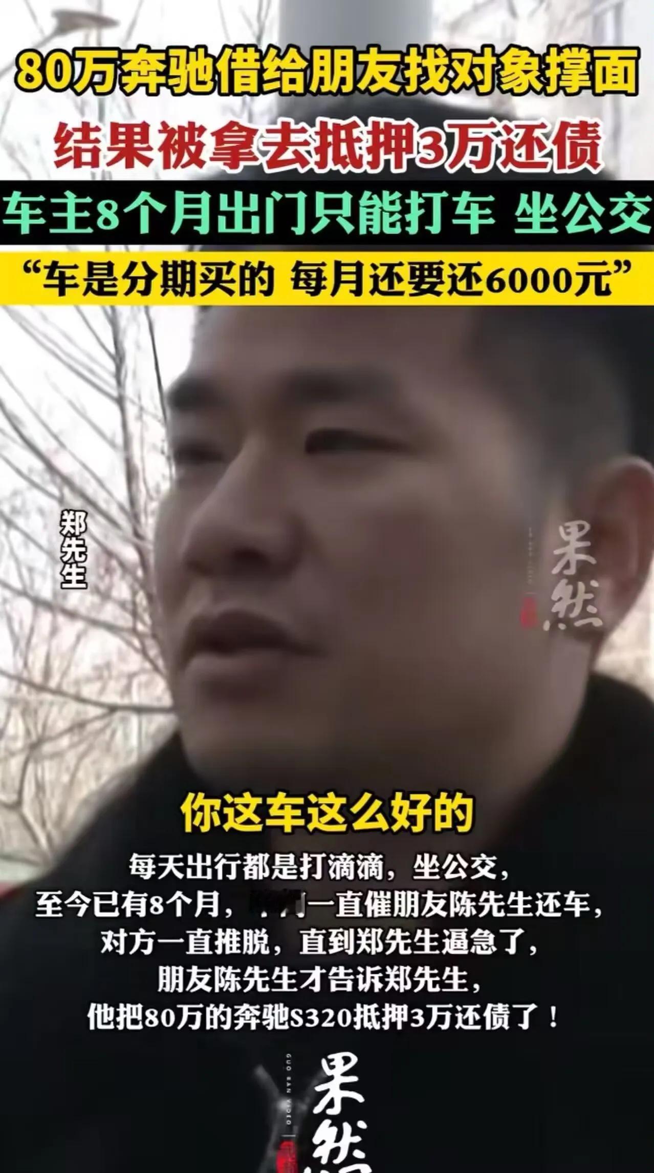 男子把80万买的大奔,借给朋友找对象撑面,自己每天打车挤公交8个月,万万没想到,朋友却将车抵押了3万还债!男子:“车是分期买的,每月还要换6000车贷,我把他当兄弟,他却这样对我,气得我一会不敢再相信任何人了!” 郑先生这样的朋友打着灯笼都找不到,陈还欺骗人家,太差劲了。 车抵押给谁了?没有机动车登记证书,没有车主身份证,没有手续,怎能抵押? 这个可以直接报警吧,无条件要回车。 这个车大概率本身也是黑户的车,要不然不可能自己有本的情况下被别人抵押,还有现在的车都有定位,不大可能找不着。 我同事这么干过 典当行是我大哥媳妇儿小弟开的 上午把我车当了46下午嫂子就给我电话了 后来就报警了。 这种自己拿不出来证件的,直接押车,相当于租出去了,所以说三万块🤦🤦,一天假设一天500×30=15000,对面那个人两个月回本,三万还得还,稳赚不赔。😂 车千万别借给朋友,我把摩托车借给朋友看,到他拿我的车装逼爽酷石子路上一会急刹车,一会儿油门拉到底,要是他自己的车肯定不会这样的,所以千万别怀疑人性。🤦🤦🤦 车绝不能借于他人,车没了还算小事,万一借车人酒驾闯下大祸,又没有赔偿能力,那车主就等着倾家荡产! 河南朋友表示:前几年也是郑州,一个人把自己豪车借给朋友,这个朋友又借给自己朋友临时开一下,就是装逼泡妞,酒驾把车撞的几乎报废,保险公司不赔付,那俩人都不管,说没钱,真是欲哭无泪,所以,车绝对不能借! 广西朋友表示:我就是像郑先生的人,所有兄弟朋友求助,我都出手帮忙,几十人借我钱,从五百至三万的都有,二十多年来,只有一个人还过钱,呵呵,当丢了! 扯淡!没行驶证!没本人签字能抵押!!! 有人说能,真能,网上有案例,去赎车还要再交钱。 北京的朋友表示:我的一八也借给山东菏泽市区的杨卫国我当时是我新车他给我开了一年,车胎没有气了还在开,我看见了问他要回来了,还借我三万多块钱到现在都给。 朋友把自己的新房给弟弟结婚用,自己用两千的手机帮弟弟办理分期买苹果,后面他弟没按时还款把自己搞成黑户,自己的车两年都给弟弟开违章给他驾照扣了只剩四分,他弟借了一万六好多年从不提还钱。