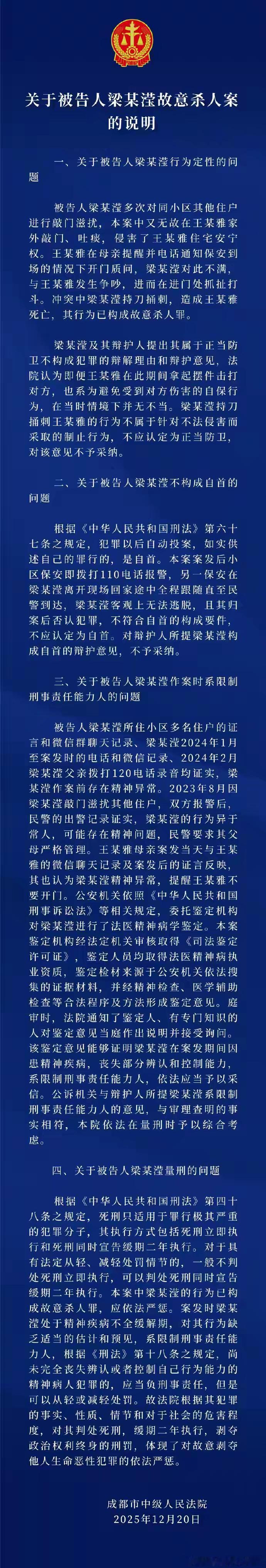 成都一女子家门口遇害案,判了!凶手梁某滢一审被判死缓。这事让人心里堵得慌。 一个精神分裂症患者,长期在小区滋扰邻居,甚至曾惊动警察。去年6月,她敲了王某雅家的门还吐痰,王某雅开门质问,冲突升级。梁某滢竟掏出刀,王某雅最终没能救回来。 法院认定梁某滢是“部分刑事责任能力”,所以从轻判了死缓。法律上或许有依据,但一条鲜活的生命没了,留下的是破碎的家庭和无尽的悲痛。精神病不是免死金牌,对受害者的公平,同样重要。这事你怎么看?评论区聊聊。