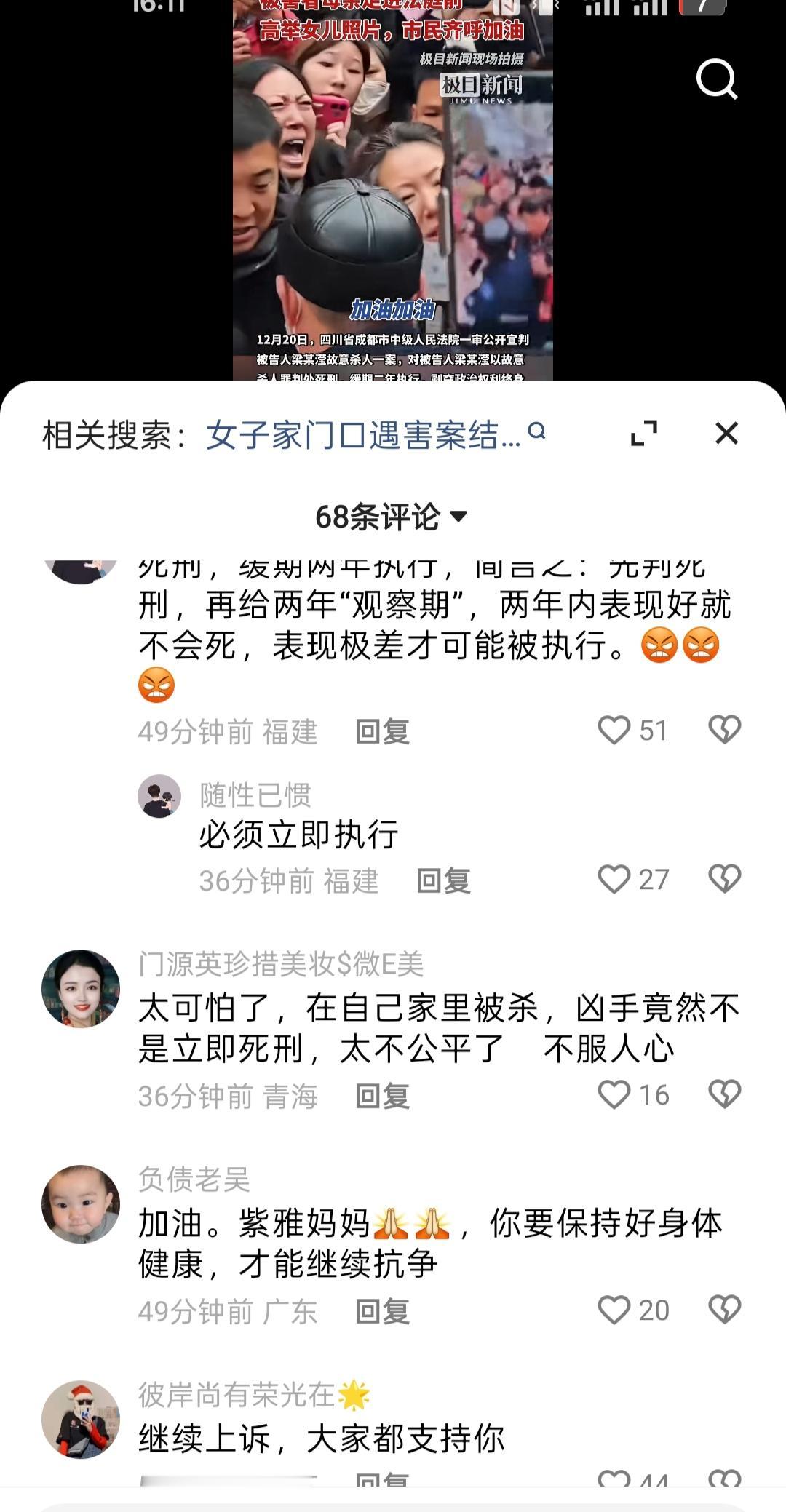 无论是法庭门口,还是网上,都无条件支持被害人妈妈再去上诉。要求立即死刑。因为死缓大家都知道有可能最后不会死。只有立即死刑,才能安抚被害人以及妈妈。 就像这位网友说的,在自己家里被杀,都不立即死刑,太不公平了,法律是保护正常人,遵纪守法的人,而不是行了凶就找办法逃脱的人。
