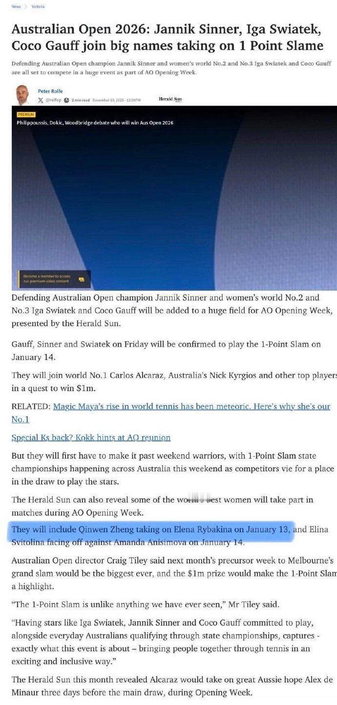 郑钦文澳网前重磅对决敲定! 《先驱太阳报》官宣:郑钦文2026年1月13日墨尔本迎战莱巴金娜,作为澳网开幕周表演赛预热正赛! 莱巴金娜手握大满贯冠军,硬地实力强劲,这场对决既是郑钦文的关键热身,更是含金量拉满的战力摸底。