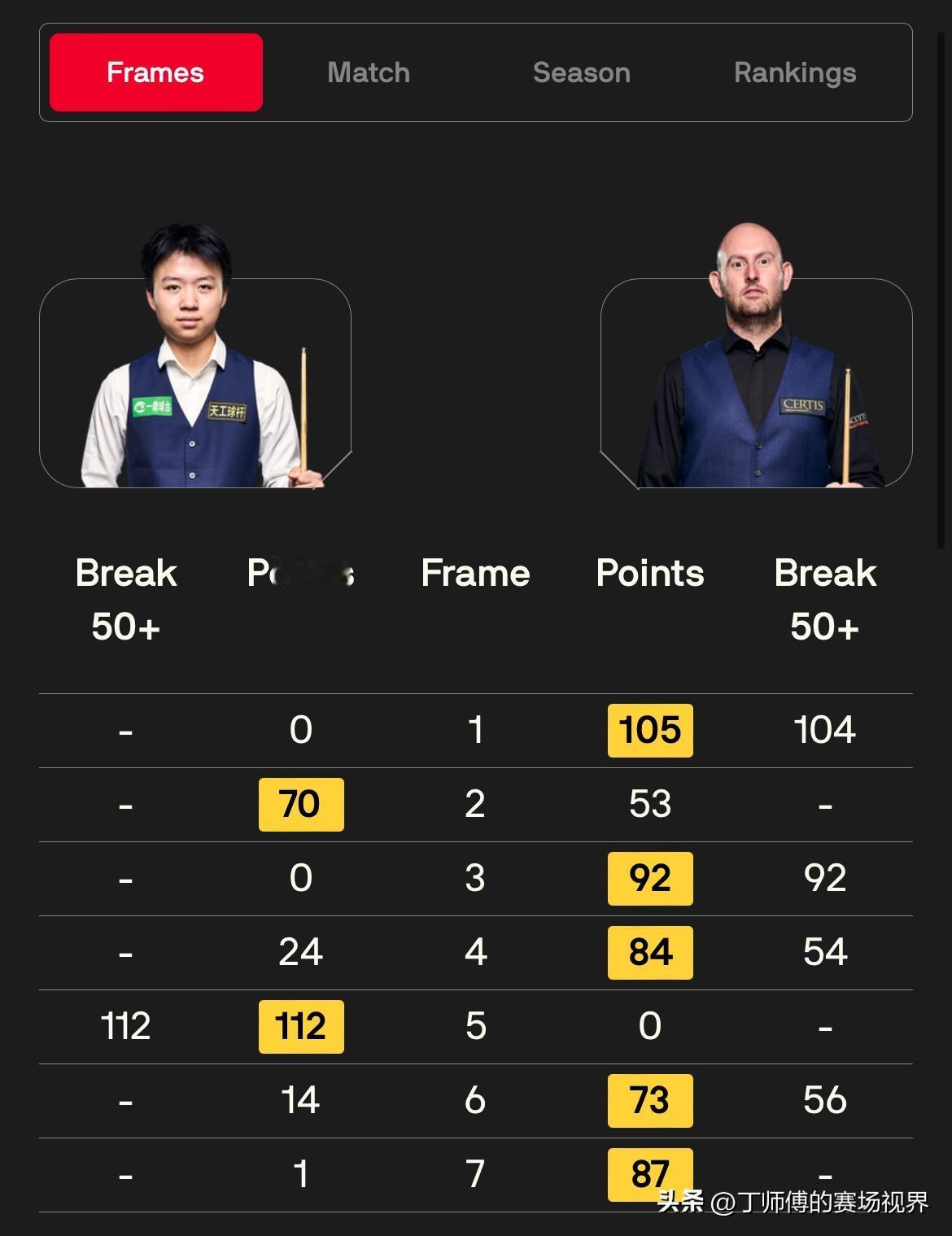 塞尔特击败江俊赛后采访:“我现在只把注意力放在出杆上,其它的事情自然会水到渠成,好消息是我已经进入到半决赛,明天会发生什么很有趣,但我不感觉自己能赢。这个赛季告诉我,明天赢不了,虽然我会继续努力,但这可能是最终结果了。”“打进半决赛是我努力最好的回报,超分的那一刻我感觉动作很生硬,明天会改进这一点。我很满意今天的表现,原本局间休息前我可以4-0领先,关键在于保持冷静,我认为我发挥得不错,而且一直保持着进攻性。” 塞尔特在苏格兰公开赛1/4决赛以5-2击败中国小将江俊,将在半决赛对阵韦克林,后者以5-3淘汰了周跃龙。