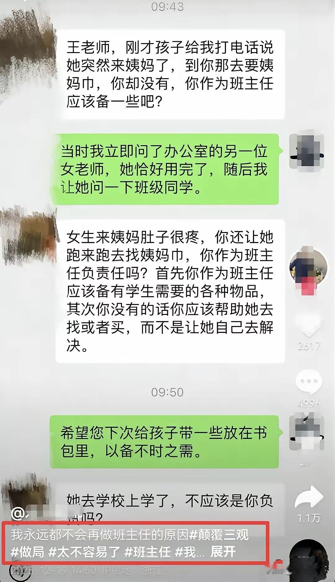 高中女生来姨妈,找男班主任要卫生巾,班主任没有,家长责怪班主任不负责,应该要有备用卫生巾。 这话一出,家长群直接炸了锅。有人说家长小题大做,男老师哪好意思囤这种私密物品;有人力挺家长,称这是关乎女生尊严的大事,学校本就该考虑周全。 当事人小敏事后红着眼说,当时肚子痛得直冒汗,实在没辙才硬着头皮找班主任求助。男老师愣了几秒,面露难色地摆手:“老师这儿真没有,你问问女同学吧。” 这话让她瞬间羞得想找地缝钻,最后还是隔壁班闺蜜悄悄递来救急包。 家长找上门时,班主任也满是委屈:“我一个男老师,平时根本想不到这些,总不能特意去买吧?” 可家长的话却戳中了要害:“你想不到,学校就该想到!青春期女孩遇到这种突发情况有多窘迫,你们体会过吗?” 这事很快在网上发酵,不少网友分享起类似经历:有人曾用校服袖子应急,有人被男生嘲笑过“邋遢”。渐渐地,大家发现争论的焦点从“班主任该不该备卫生巾”,变成了“我们的教育里,是否缺失了对女生的关怀”。 最后学校回应,会在每个教室的便民箱里配齐卫生巾、红糖姜茶,男老师也接受了培训,学会了更妥帖地应对这类求助。 其实这事哪有什么输赢,不过是希望每个青春期女孩,都能被温柔以待,不用在窘迫时独自硬扛。 评论区聊聊:你上学时遇到过这种尴尬吗?当时是怎么解决的?