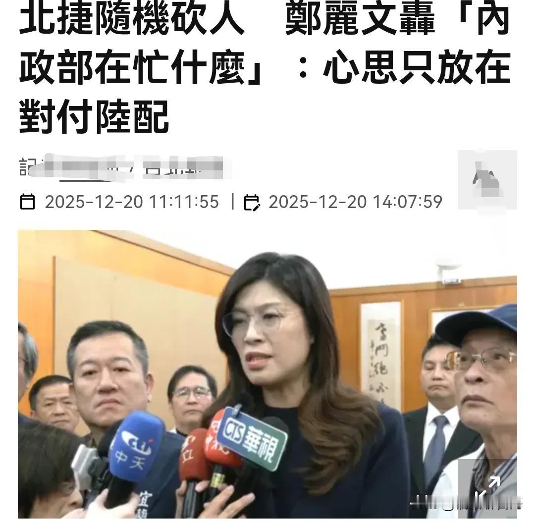 台北捷运发生随机砍人事件 郑丽文:内政部门在忙什么? 心里只想着对付陆配 2025年12月20日,昨晚,台北捷运站发生一起令人震惊的随机砍人事件,造成4人遇难、11人受伤。嫌疑人张文在台北车站及中山商圈投掷烟雾弹后,持刀冲向人群进行袭击,最终在逃离过程中从高处坠楼身亡。 国民党主席郑丽文对此事件表示强烈谴责,并对负责台湾治安的内政部门提出质疑。她在接受采访时指出,内政部门负责人似乎将注意力集中在对付陆配问题,而忽视了治安的重要性。郑丽文强调,“为什么治安问题总是要等到发生重大事件后才引起重视?” 郑丽文呼吁应更加关注社会安全网的建设,指出自蔡英文上任以来,相关政策未能有效落实,导致今日的惨剧。 她表示,这种“个人孤狼式”的攻击在台湾的善良社会中几乎是不可想象的。郑丽文敦促赖清德放下政治斗争,真正关心社会的安全与稳定,并警告如果仇恨继续蔓延,社会将付出难以承受的代价。 郑丽文最后呼吁内政部门负责人应正视治安问题,立即采取措施,以避免未来类似事件的再次发生。她指出,治安与社会安全网的失灵已然成为亟待解决的重大课题,呼吁应重视公众安全,让民众能够安心生活。