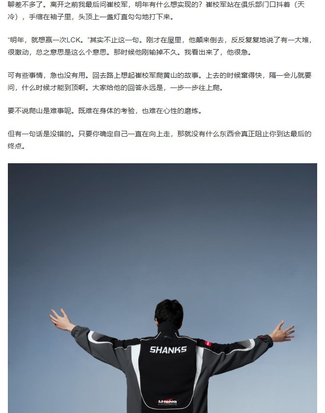 一个一直在经历失败的人,终有一天会成功!LPL官方分享了Shanks的人物故事。文中复盘了他这一年的心路历程:从AL组建初期的迷茫,到第二赛段斩获优胜,再到那场著名的“凌晨大辩论事件”等!看完这篇文章后是真的有被感动到,今年对Shanks来说绝对是很特别的一年,哪怕世界赛不敌T1止步八强,哪怕2025年充满着遗憾,Shanks想着的永远不是失败,而是明年想赢一次LCK!Shanks眼中的25AL Shanks选手故事Shanks说明年想赢一次LCK