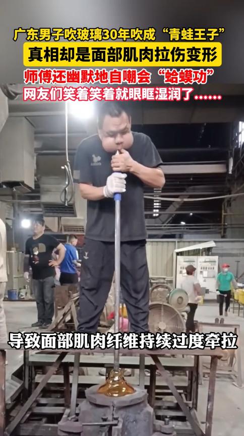 “悲剧还是发生了!”广东,一男子在工厂吹了30年玻璃,一天最多要吹300多个,结果腮帮子变大,面部肌肉严重拉伤,鼓起气来就像青蛙一样!有时男子还调侃自己练成了“蛤蟆功”,可网友看后表示:笑着笑着就哭了! 这位男子姓张,是当地小有名气的手工玻璃吹制师傅,从年轻时一头青丝入行,到如今两鬓添了风霜,这门手艺他一守就是30年。 每天一上班,他要做的第一件事就是检查那根1.5米长的铁吹管,确认没问题后,就站到温度高达1000到1300℃的熔炉旁,开始一天的工作。 熔炉里的熔融玻璃像一团流动的岩浆,他得精准地用吹管蘸取适量玻璃液,然后快速移到操作台,一边持续吹气一边调整造型,整个过程就几秒时间,容不得半点马虎。 原来,手工吹玻璃这活儿看着简单,实则全靠嘴和手的默契配合,尤其是吹气的力度和节奏,差一点成品就会变形报废。他每天要在岗位上站满8个小时,每分钟至少吹气15次,遇上订单多的时候,一天下来要吹300多个玻璃制品,腮帮子就没歇过几分钟。 刚入行的前几年,他的脸和普通人没两样,可随着日复一日高强度的吹气,变化慢慢出现了。 入行第5年,他发现自己的脸开始变宽,当时只以为是劳累导致的,没太在意;到了第10年,面部肌肉经常出现僵硬和疼痛感,张嘴时颞下颌关节还会发出弹响,吃饭都变得不顺畅。可即便这样,他也没想着放弃,毕竟这门手艺是他安身立命的根本。 没想到30年后,面部的变化越来越明显,颊肌和咬肌因为长期反复牵拉、损伤后增生,厚度达到了常人的1.5倍,形成了旁人眼中“青蛙脸”的模样,颞下颌关节紊乱的问题也越来越严重,甚至下颌骨都因为长期受力变宽,医生说再这样下去,晚年可能会出现咀嚼困难的情况。 而且,他的工作环境远比外人想象的恶劣。熔炉旁的温度常年超过40℃,夏天的时候更是闷热难耐,长期在这样的环境下工作,他的面部已经出现了热激红斑的早期症状。 玻璃熔化时产生的二氧化硅粉尘弥漫在空气中,虽然戴着口罩,可还是难免吸入,要知道这个行业矽肺病的检出率高达52%,这些粉尘时刻在损伤着他的呼吸道。 除此之外,长期弯腰操作、手臂悬空拿着沉重的吹管,让他早早患上了肩周炎和腰椎间盘突出,手部也因为常年握持吹管,出现了腱鞘炎的症状,阴雨天的时候,关节处的疼痛感会格外强烈。 面对这些职业带来的身体改变,张师傅没有抱怨,反而经常自嘲自己是“青蛙王子”,笑称这是练会了独门“蛤蟆功”。 他总说,手工吹制的玻璃制品,尤其是那些复杂造型和艺术定制的产品,机器根本替代不了,每一件成品都凝聚着工匠的心血,自己这张“变形”的脸,就是多年坚守这门手艺的最好印记。 靠着这门稀缺的技艺,他现在月薪能过万,在当地算得上不错的收入,可即便如此,也几乎没有年轻人愿意来学这门手艺。毕竟,这门手艺需要十几年的苦练才能出师,过程又苦又累,还容易落下一身职业病,年轻人大多吃不了这份苦。 网友们一开始刷到张师傅的视频时,还觉得这“青蛙脸”有点新奇好笑,可当了解到他背后30年的坚守和付出,知道了这张脸背后的艰辛与不易后,纷纷表示“笑着笑着就哭了”。大家心疼他被职业病折磨的身体,更敬佩他对传统手艺的执着坚守。 其实,张师傅的经历让人忍不住感慨,那些我们眼中精致的手工玻璃制品,背后都是工匠用健康换来的。所谓的职业印记,说到底是岁月和艰辛刻下的痕迹。 更让人担忧的是,随着像张师傅这样的老工匠慢慢老去,又没有年轻人愿意接手,这门承载着传统技艺的手工吹玻璃手艺,正一步步走向濒危。 我们总在说要传承传统技艺,可如果没有人愿意为这份传承付出,这些珍贵的手艺最终可能只会消失在时光里。 这不是某一个人的遗憾,而是整个社会的损失,毕竟,每一门传统手艺的消失,都是一段历史和文化的落幕。
