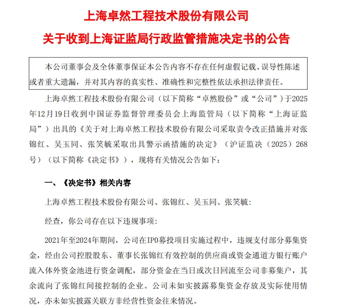 经查,卓然股份在2021年至2024年期间,在IPO募投项目实施过程中,违规支付部分募集资金,经由公司控股股东、董事长张锦红有效控制的供应商或资金通道方银行账户流入体外资金池进行资金调配,部分资金在当日或次日回流至公司非募集户,其余流向了张锦红间接控制的企业。公司未如实披露募集资金存放及实际使用情况,亦未如实披露关联方非经营性资金往来情况。