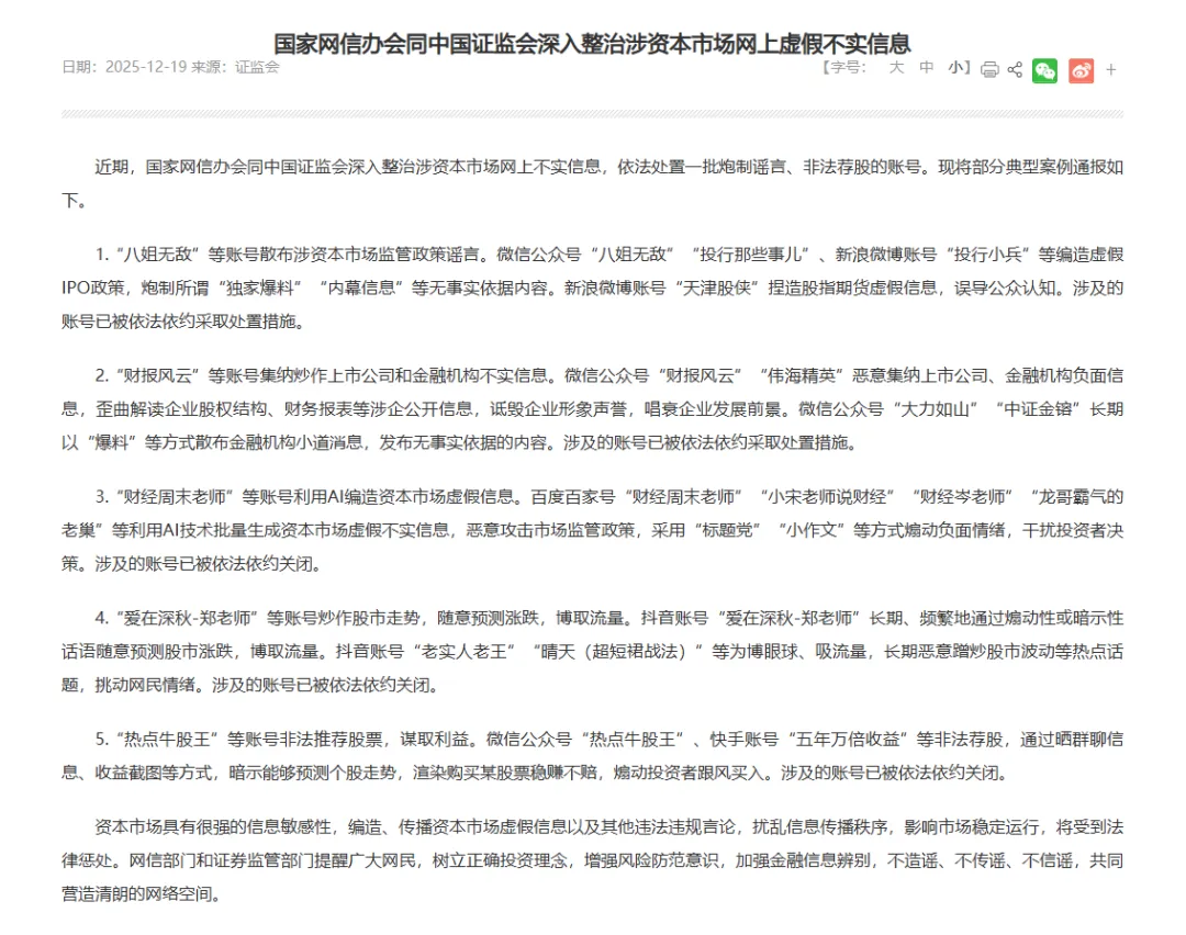 此次专项整治行动聚焦五大类突出问题,对散布监管政策谣言、抹黑金融机构和上市公司、利用AI编造虚假信息、炒作股市走势以及非法推荐股票等行为实施精准打击。微信公众号“八姐无敌”“投行那些事儿”、新浪微博账号“投行小兵”、百度百家号“财经周末老师”、抖音账号“爱在深秋—郑老师”等一批违规账号已被依法依约关闭。