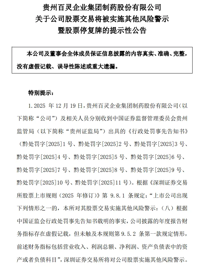 12月19日,贵州百灵发布公告称,公司及相关当事人已收到贵州证监局送达的《行政处罚事先告知书》。