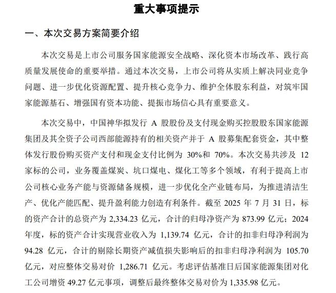 公告显示,中国神华拟通过发行A股股份及支付现金的方式购买国家能源集团持有的国源电力100%股权、新疆能源100%股权、化工公司100%股权、乌海能源100%股权、平庄煤业100%股权、神延煤炭41%股权、晋神能源49%股权、包头矿业100%股权、航运公司100%股权、煤炭运销公司100%股权、港口公司100%股权,并以支付现金的方式购买西部能源持有的内蒙建投100%股权;同时,上市公司拟向不超过35名特定投资者发行A股股份募集配套资金。交易价格1335.98亿元。