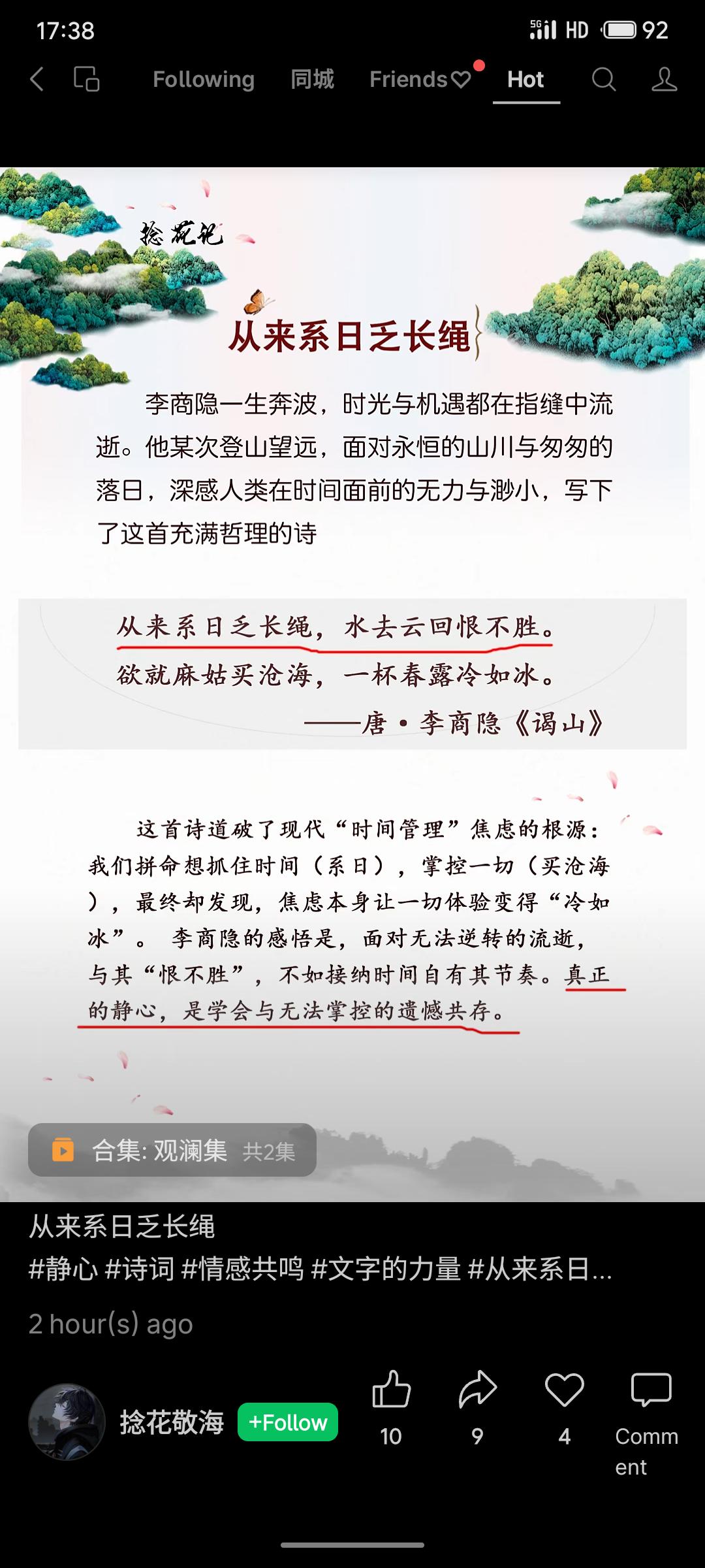李商隐在《谒山》中感叹时光流逝,以“系日长绳”“买沧海”喻人力之渺小。诗作揭示了现代时间管理焦虑的根源——强求掌控反而让体验冰冷。其启示在于接纳时间的自然节奏,与无法改变的遗憾共存。