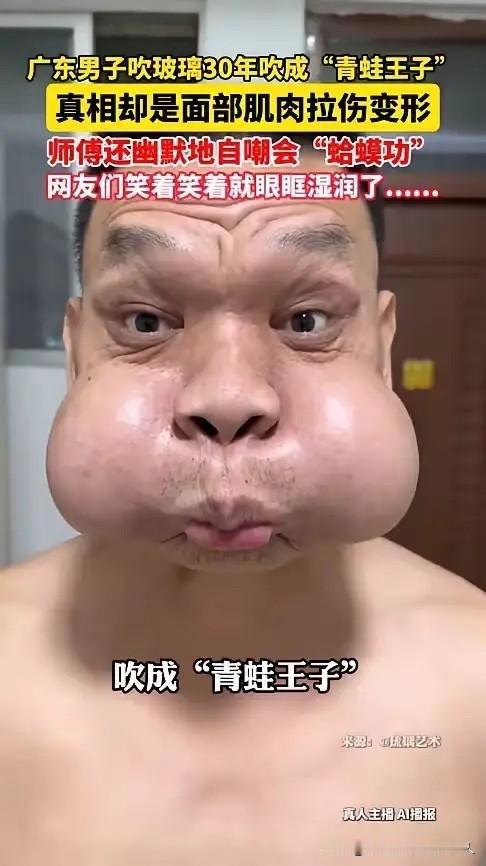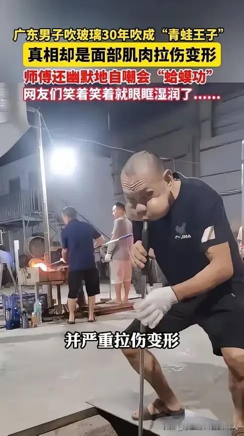 太心酸了!广东一名男子在工厂吹了30年玻璃,一天最多要吹300多个。常年高强度发力,让他的面部肌肉严重拉伤、异常松垮,腮帮子变得肿大,鼓起气来像青蛙一样,整张脸几乎都变形了。 这分明就是拿健康换生计啊!明明是重复性强的工种,怎么就没能被机器替代?辛辛苦苦挣来的薄薪,根本不够日后弥补健康的损耗。 更让人揪心的是,用身体熬出来的这点钱,和被毁掉的健康完全不成正比。没了健康,再多钞票也毫无意义。可现实就是这么无奈,为了养家糊口,很多普通劳动者根本没得选。他们用最珍贵的身体,换一家人的温饱,后续的治疗费用却可能高到离谱。真心希望社会保障能更给力些,稳稳接住这些为生活拼尽全力的人。